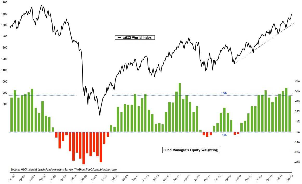 上月的美林基金经理调查显示,基金经理们对全球股市的风险敞口相当大,选择超配的基金经理净占比达到60%。10月调查显示这一比例有所回落,但仍高达49%,差不多高出10年均值一个标准差。