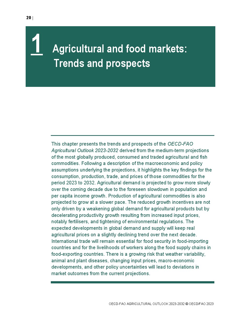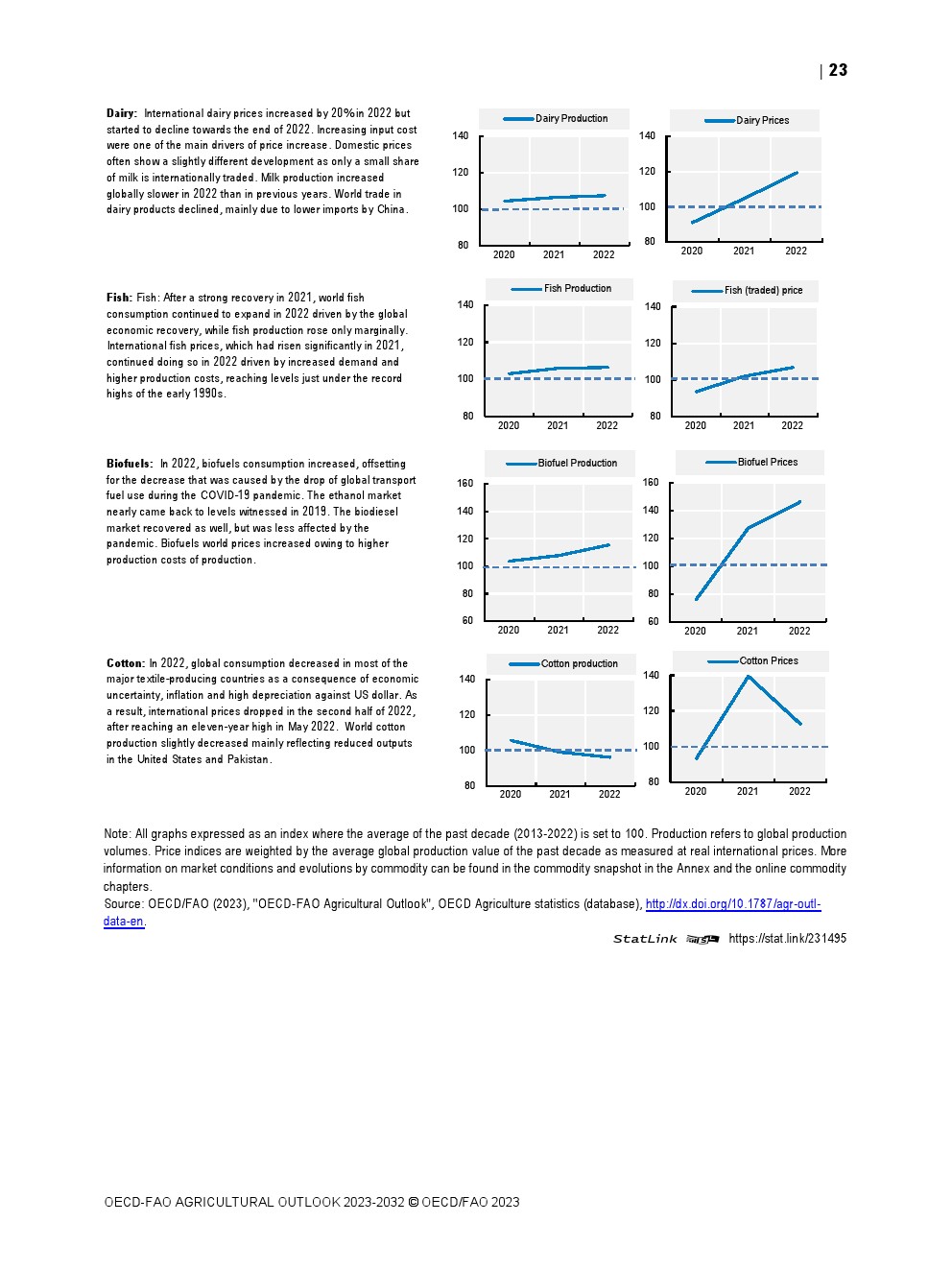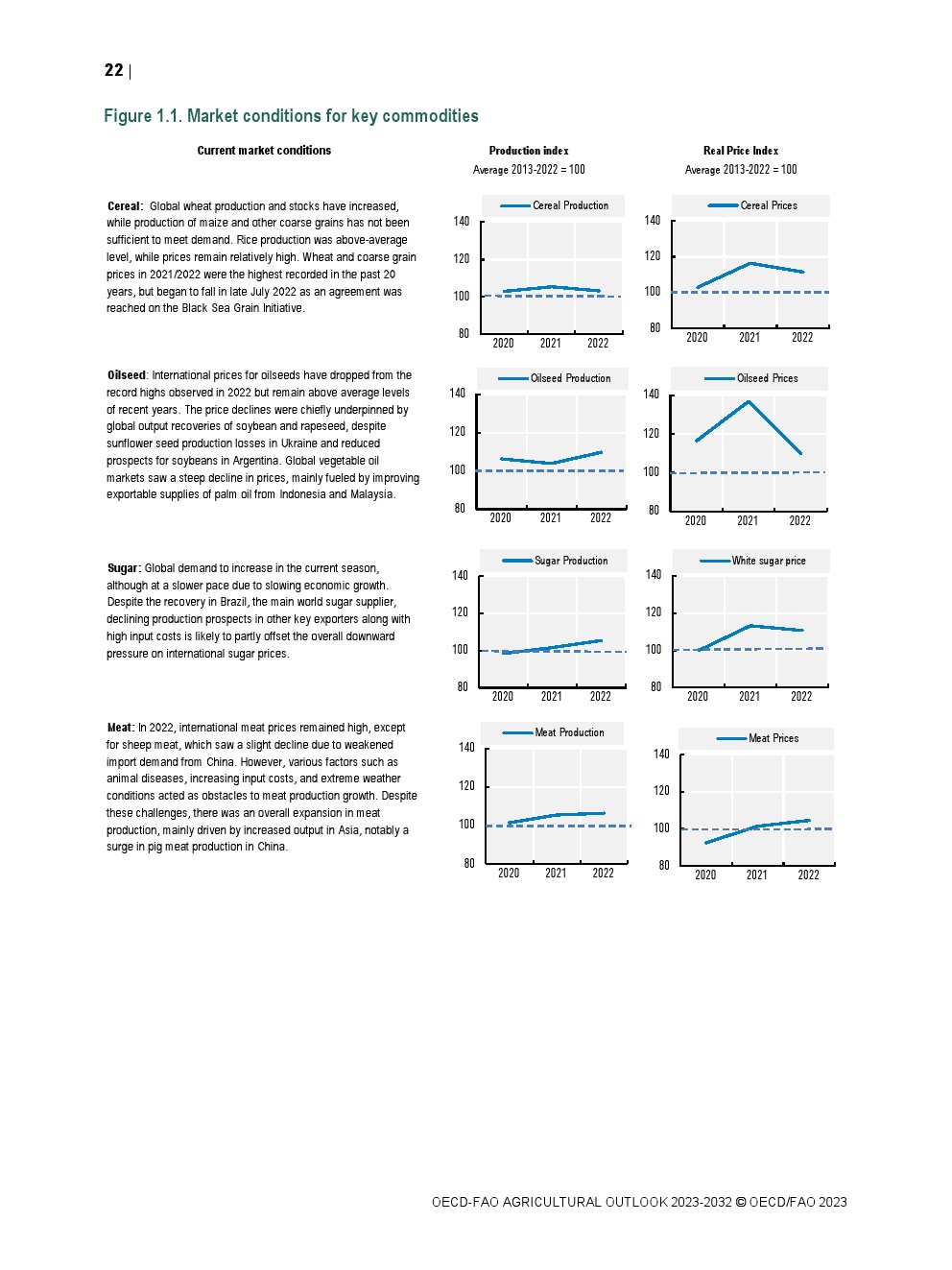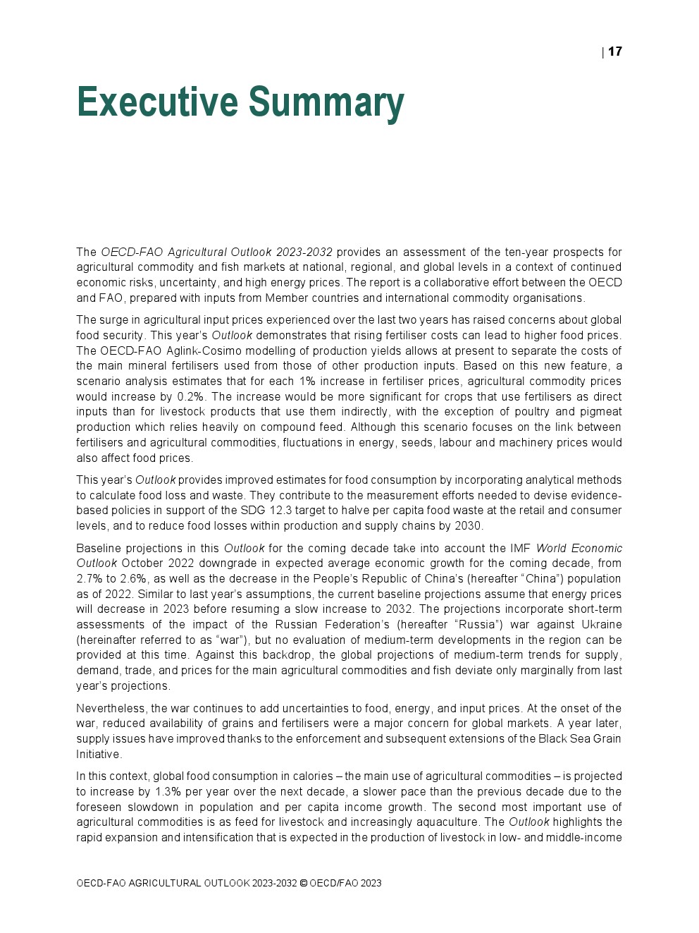 经合组织发布了“2023-2032年农业展望”,评估了在经济风险、不确定性和高能源价格持续存在的背景下,国家、区域和全球各级农产品和鱼类市场的十年前景。该报告是经合组织与粮农组织之间的合作成果,根据成员国和国际商品组织的投入编写。