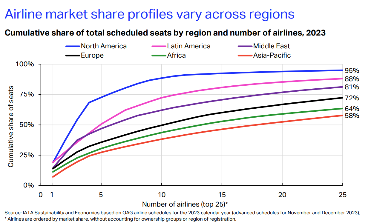 三个最大的区域市场(北美、欧洲和亚太)表现出不同程度的市场集中度。北美的陡峭曲线表明了高度的集中度,前三大航空公司占该地区50%的定期运力,前十大航空公司占89%的总市场份额。另一方面,亚太市场的集中度最低。多达18家航空公司占该地区总市场的一半。