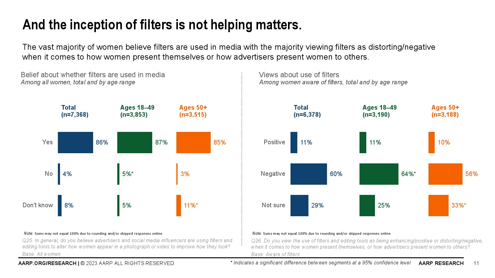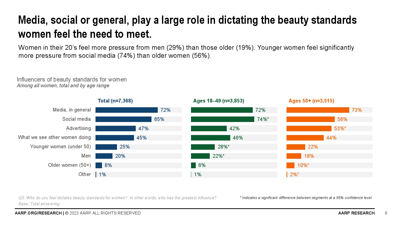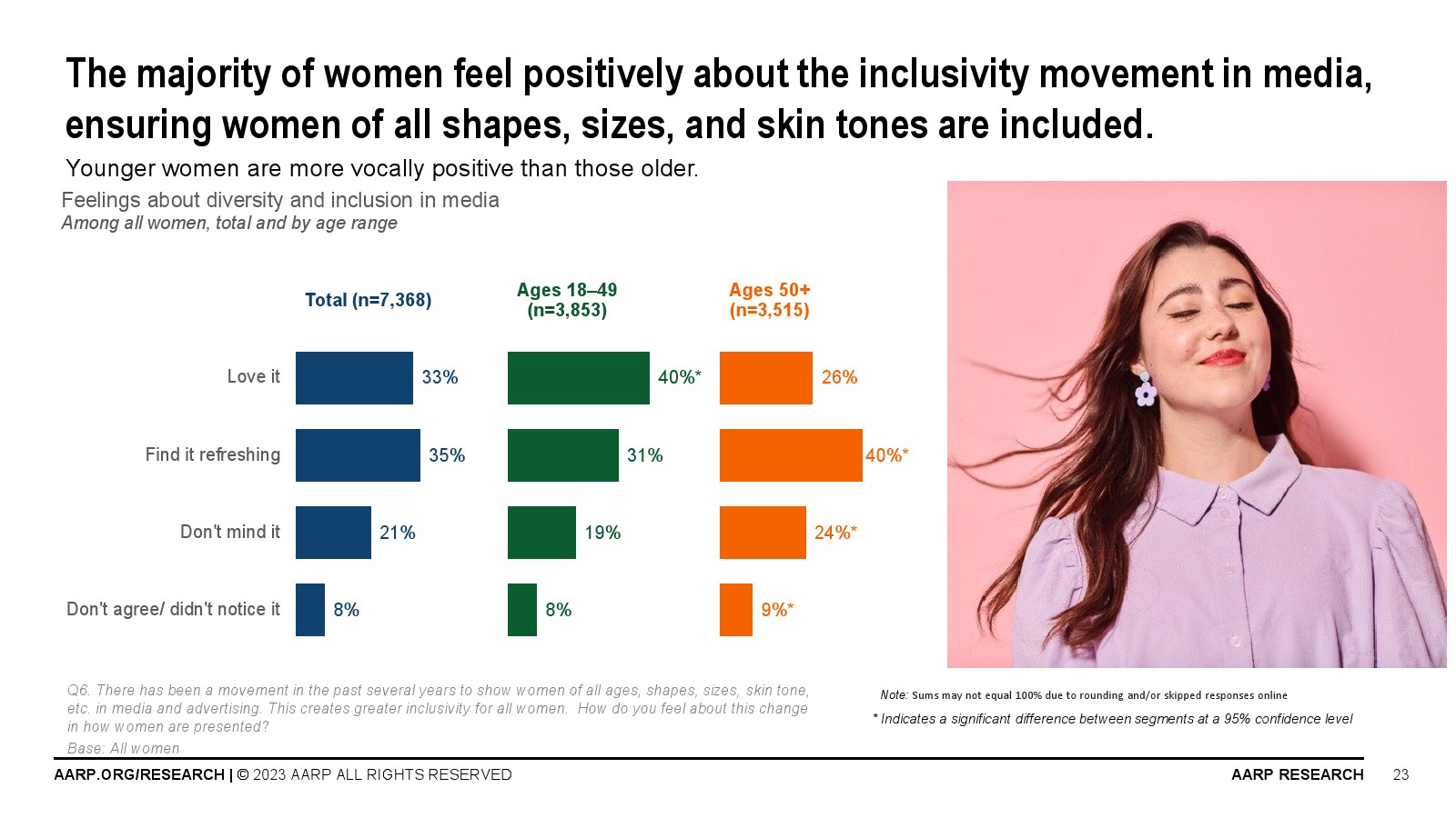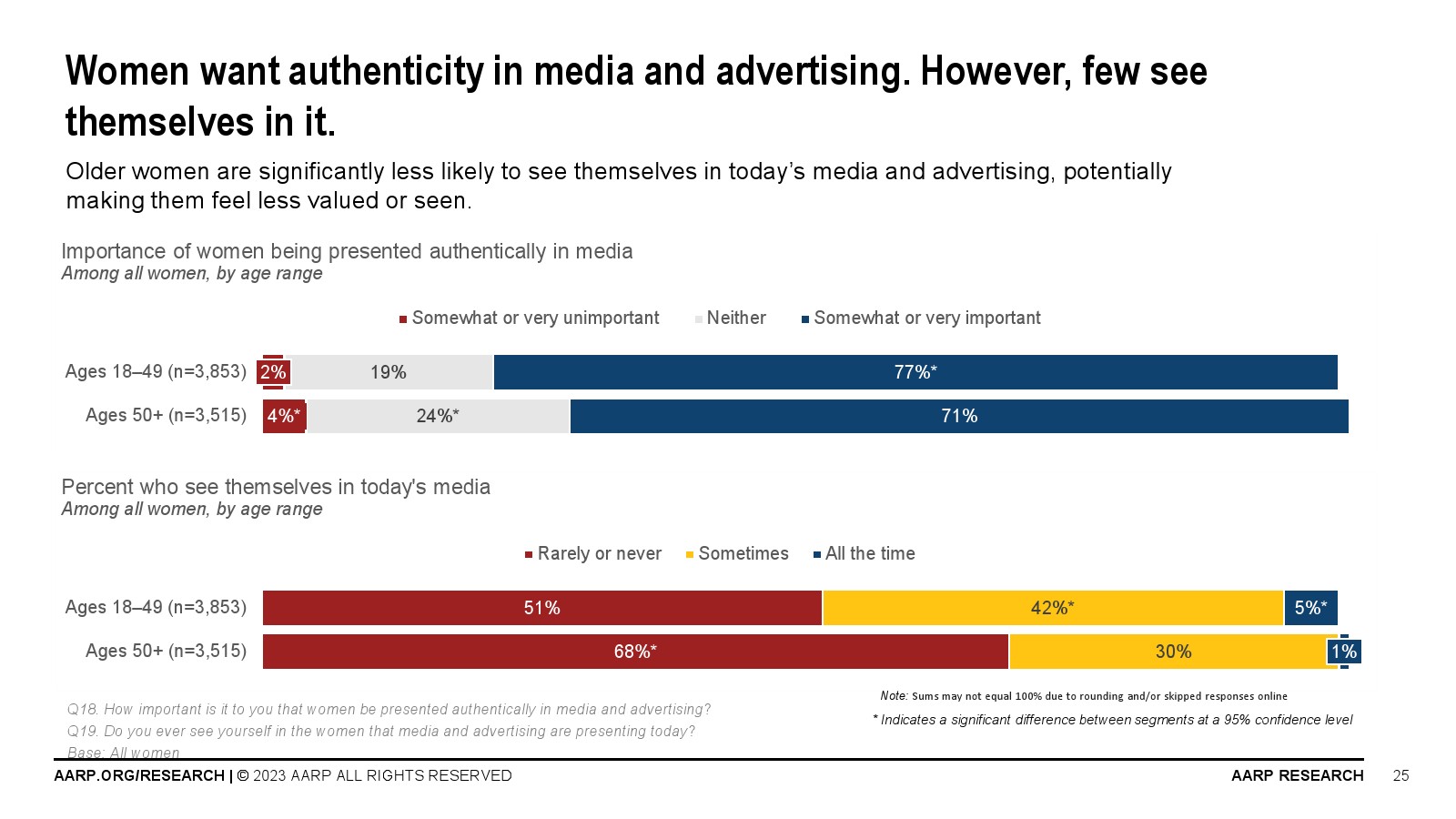 美国退休人员协会(AARP)的一份报告显示,年龄在18-49岁之间的美国女性中有77%认为,女性在媒体上的真实形象有些或非常重要;50岁及以上的女性中有71%的人持同样观点。