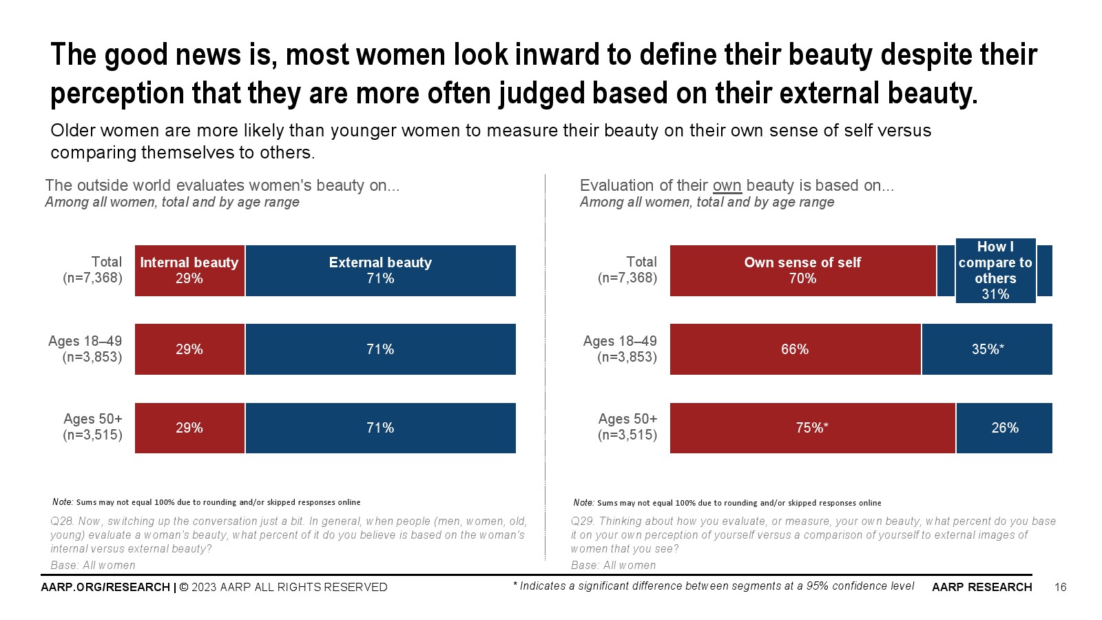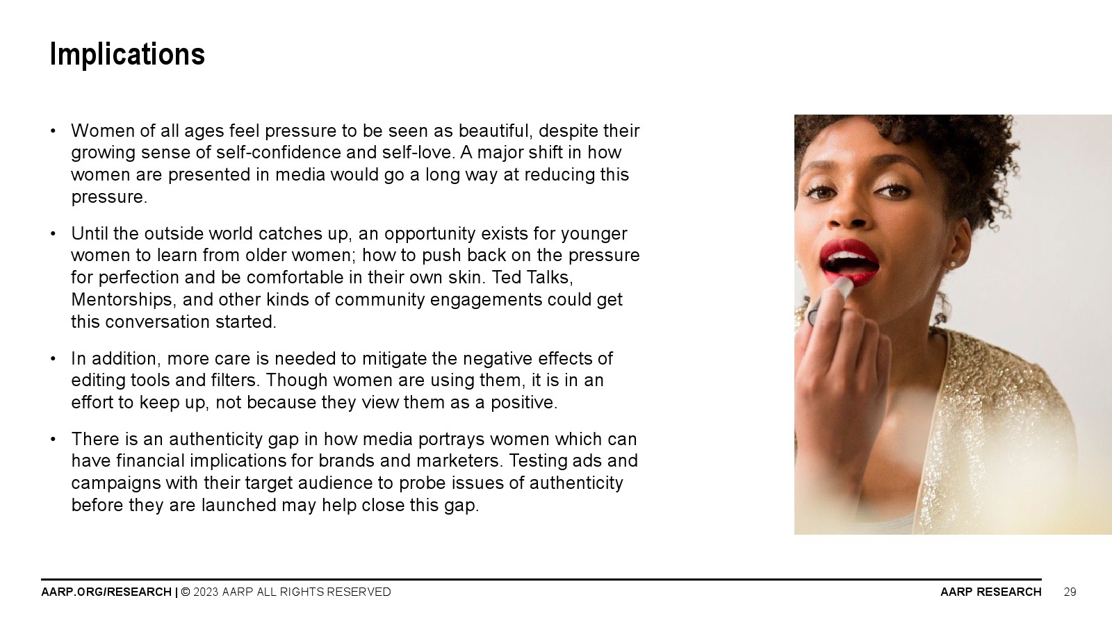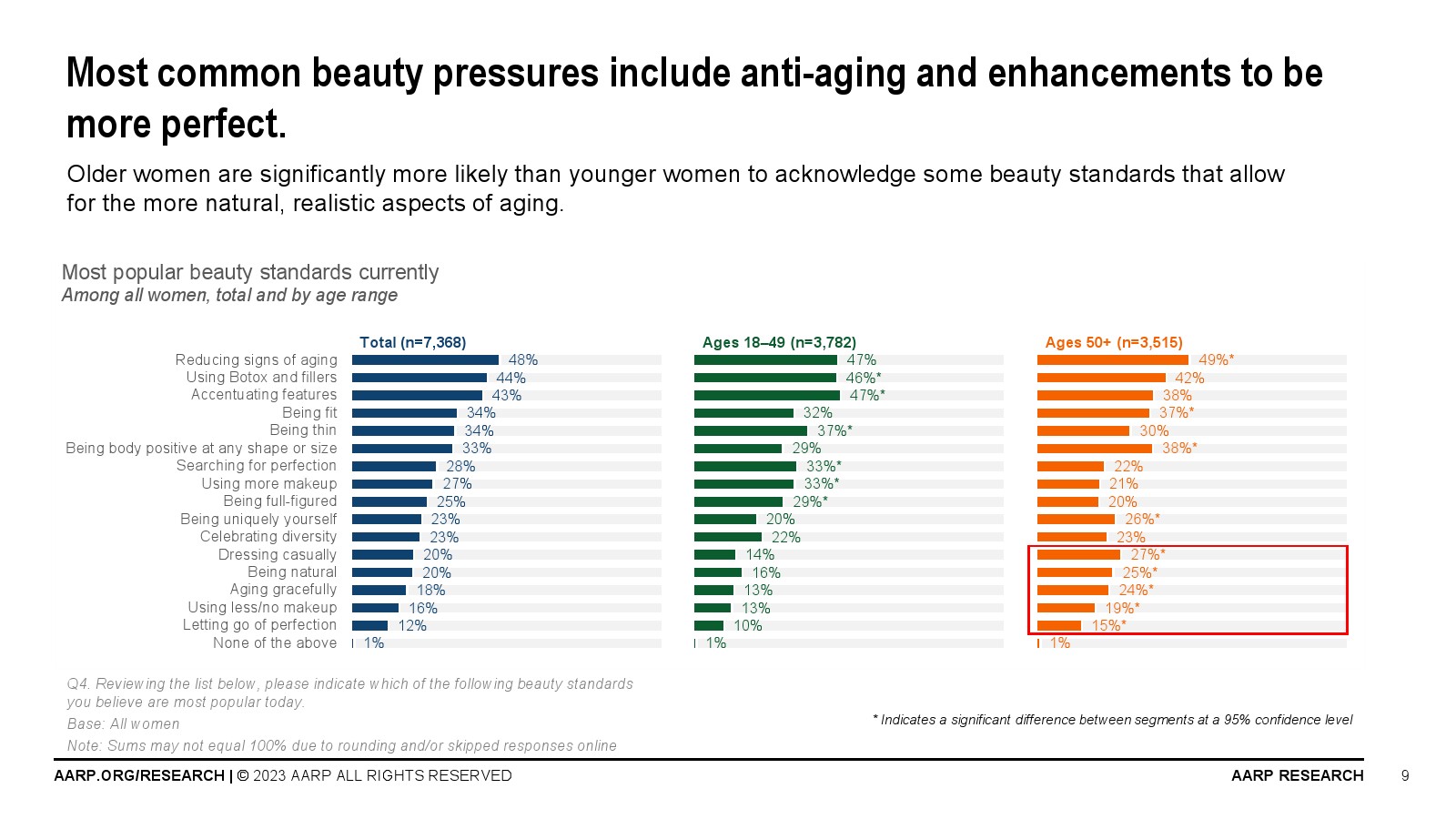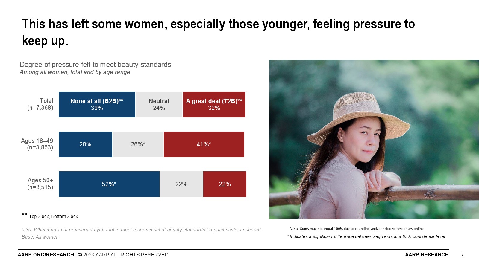 美国退休人员协会(AARP)的一份报告显示,年龄在18-49岁之间的美国女性中有77%认为,女性在媒体上的真实形象有些或非常重要;50岁及以上的女性中有71%的人持同样观点。