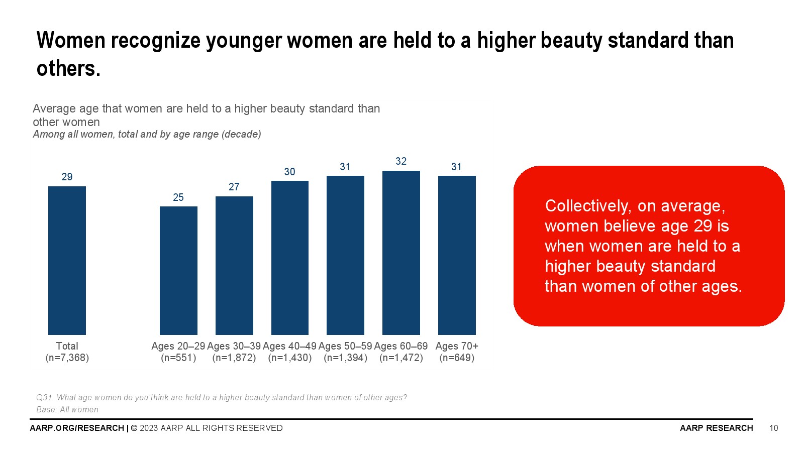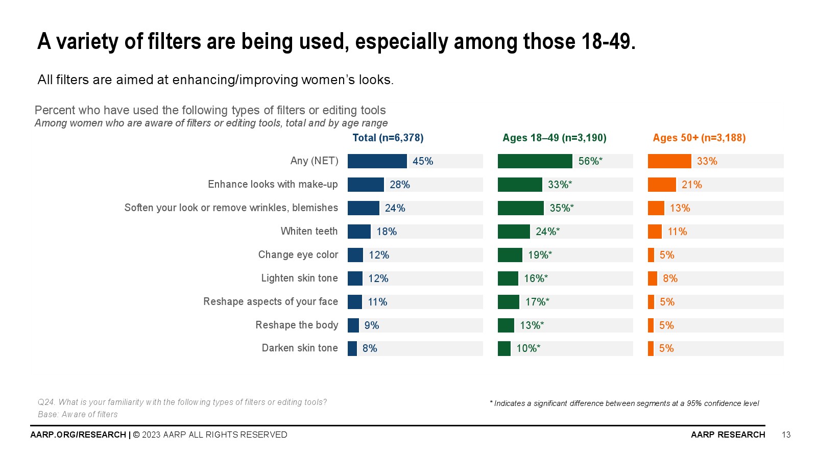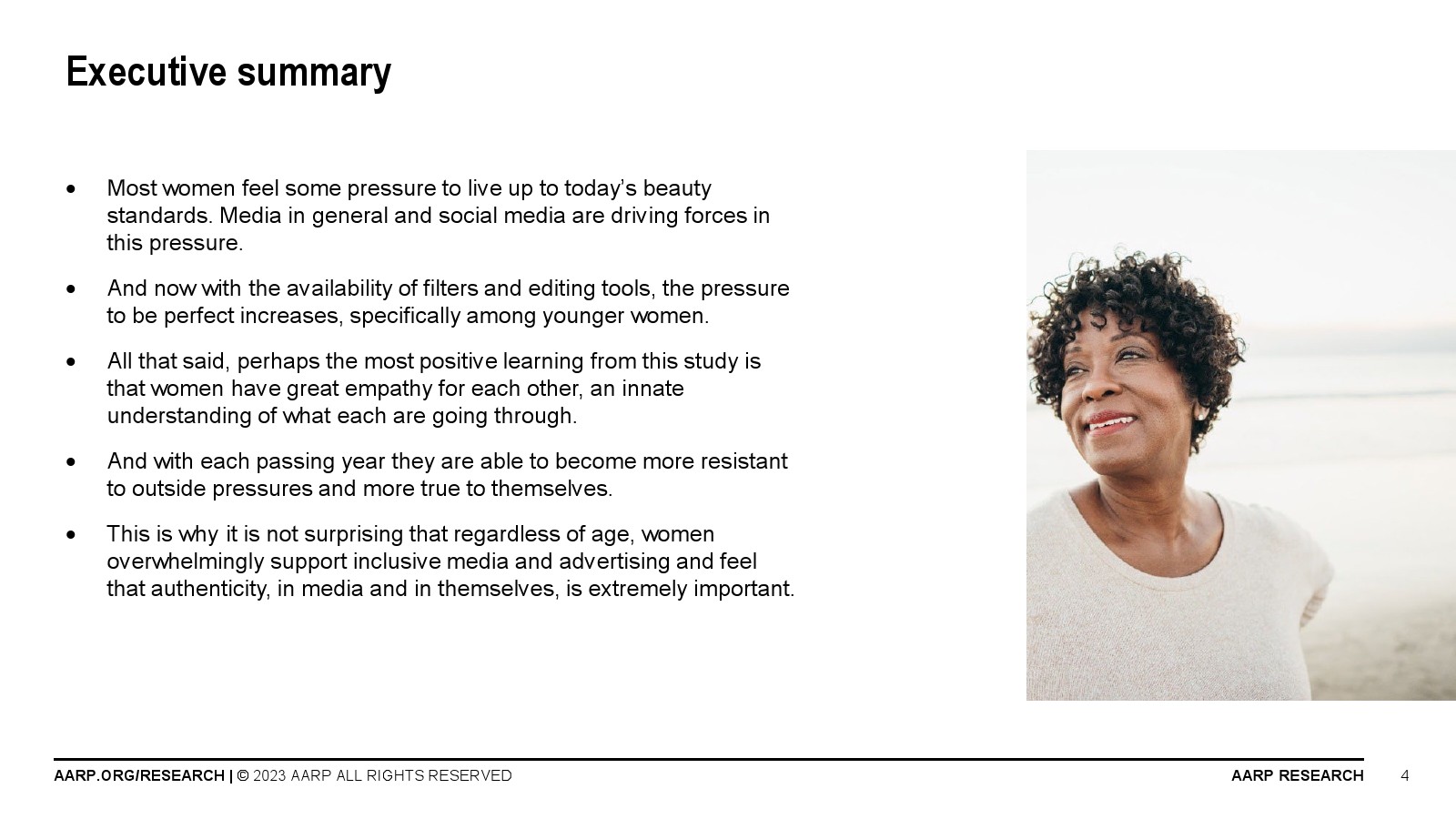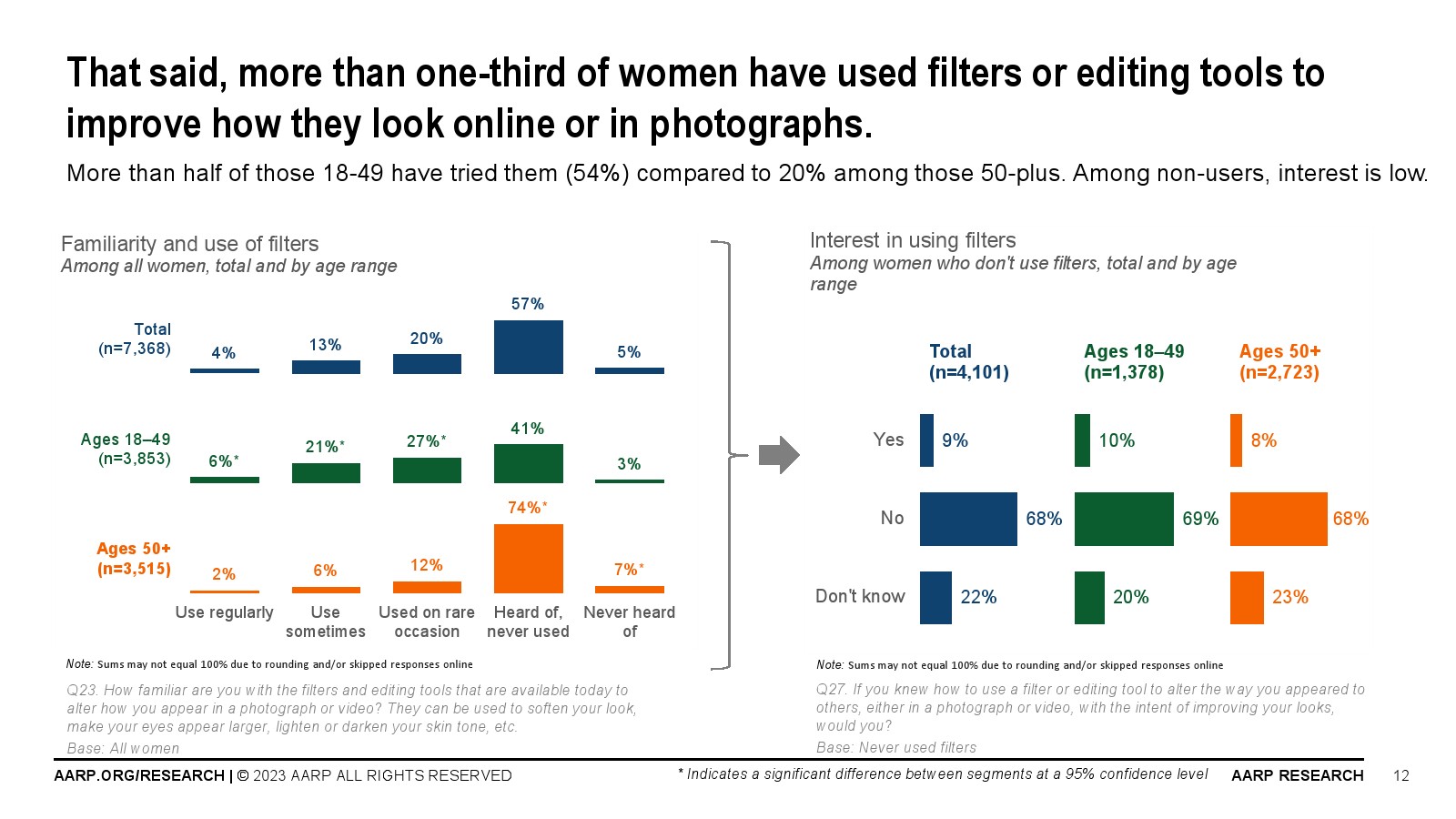 美国退休人员协会(AARP)的一份报告显示,年龄在18-49岁之间的美国女性中有77%认为,女性在媒体上的真实形象有些或非常重要;50岁及以上的女性中有71%的人持同样观点。
