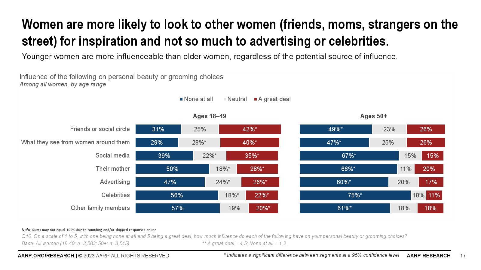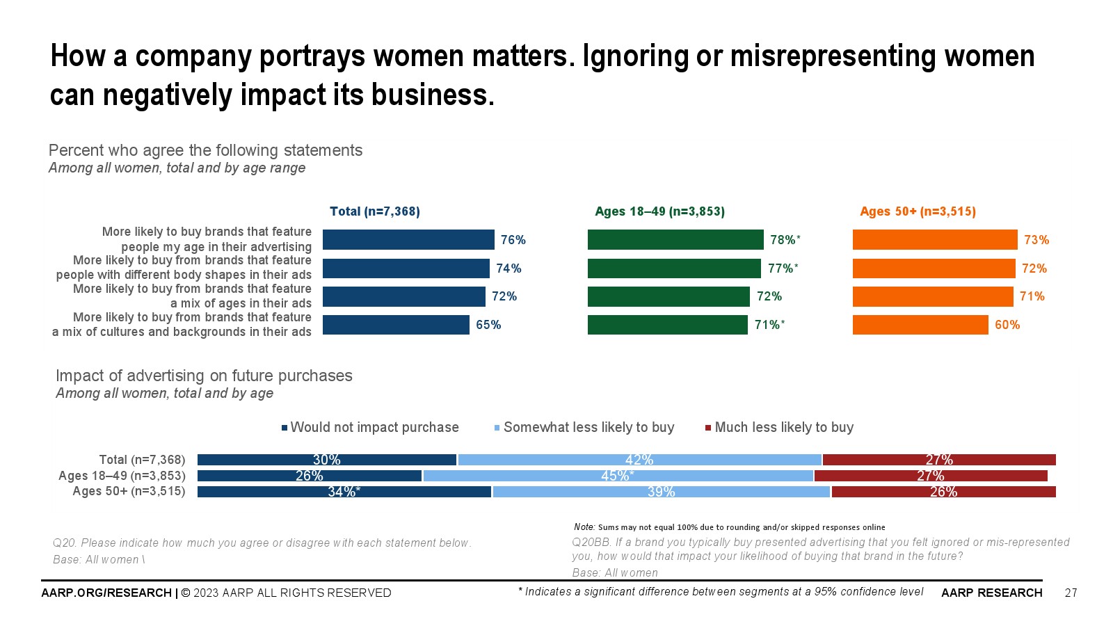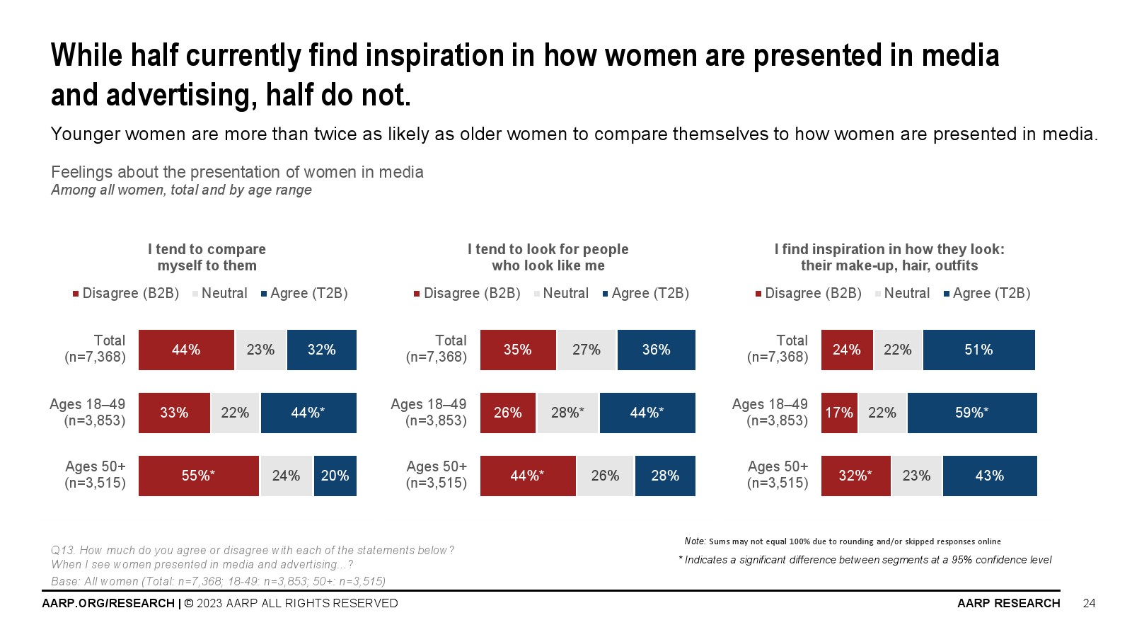 这一结果让人想起了美国退休人员协会(AARP)之前的一项研究。50岁及以上的女性更有可能觉得广告中对老年女性的描绘是负面的(21%),而不是正面的(18%)。