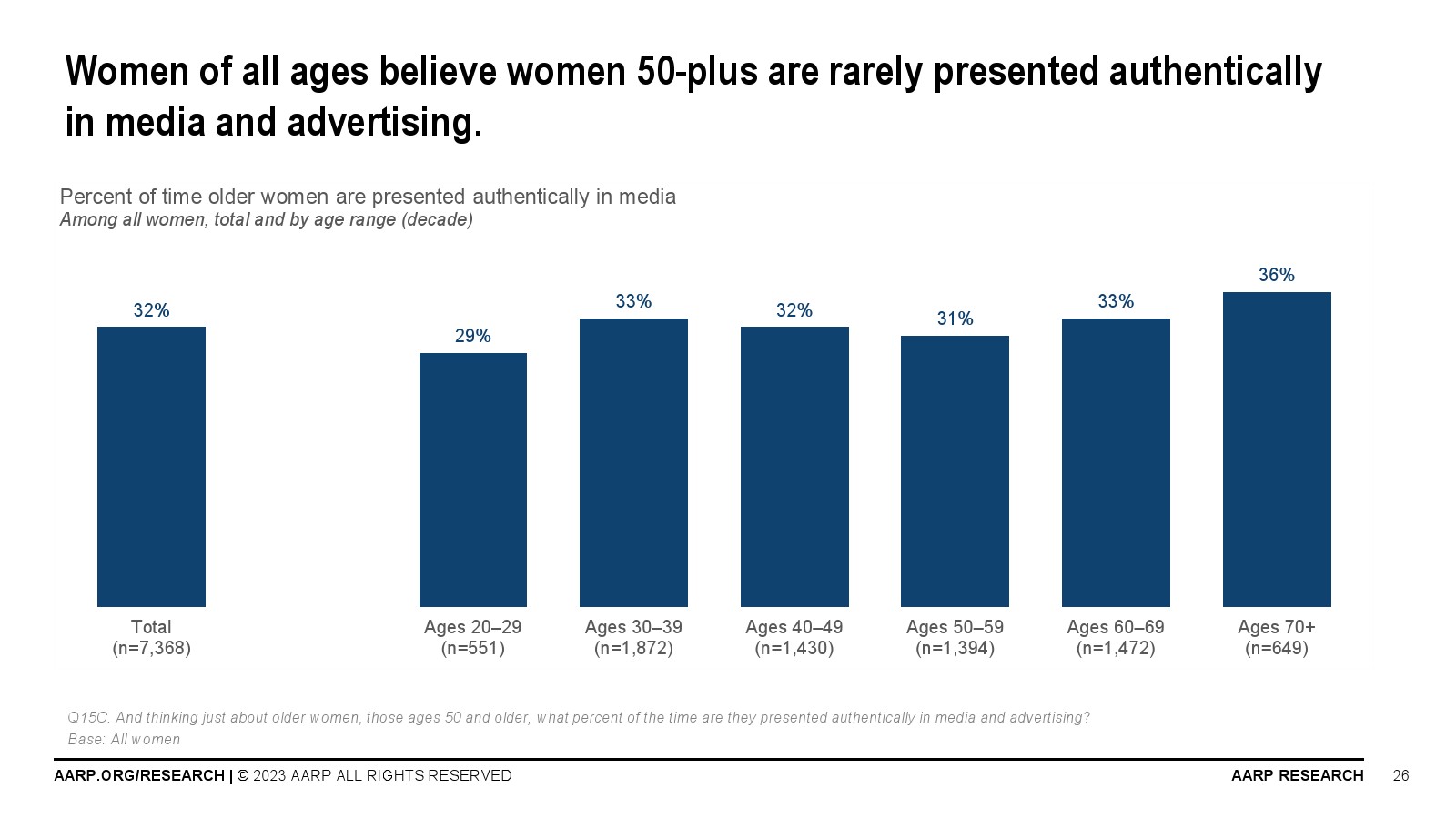 事实上,受访者认为,50岁及以上的老年女性在媒体和广告中真实出现的时间不到32%。
