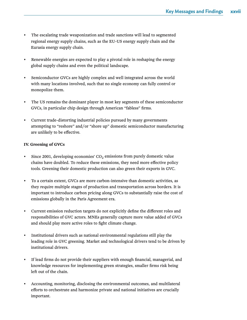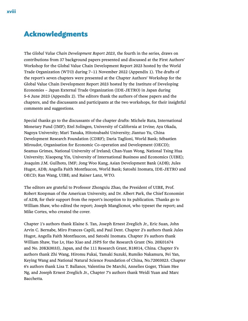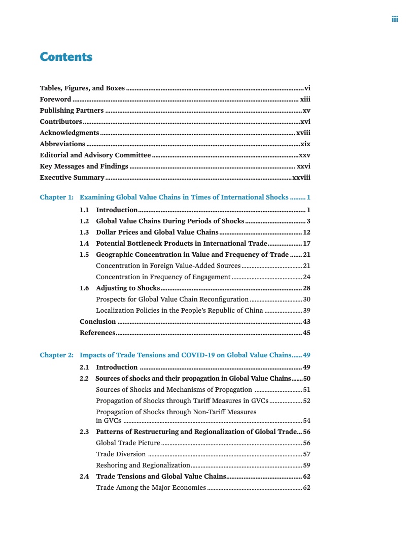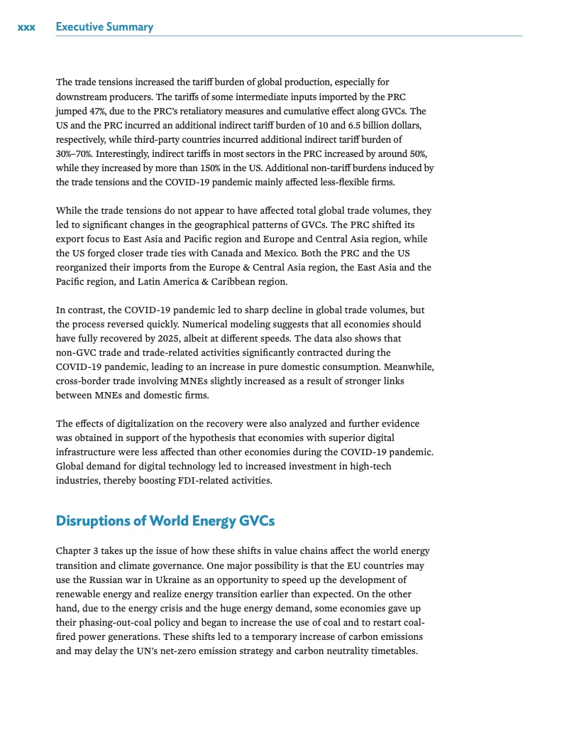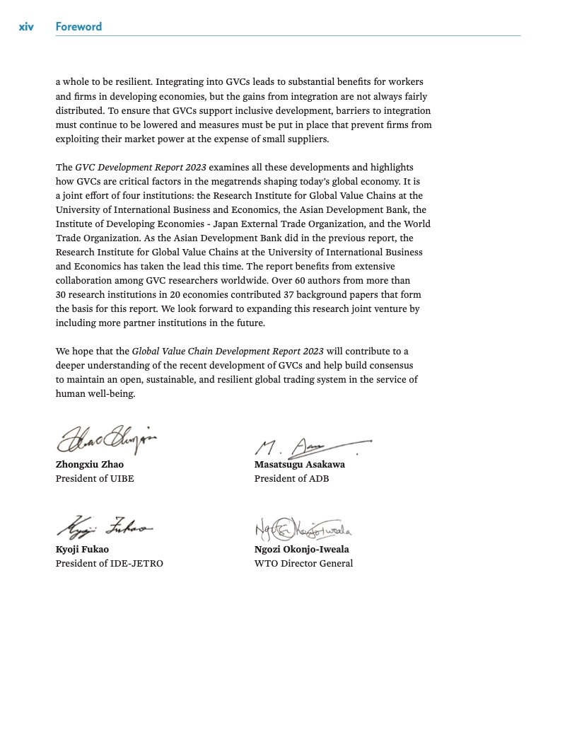 “最近发生的与新冠疫情相关的破坏事件暴露了全球价值链中长期存在的脆弱性,特别是与过度集中和过度依赖单一经济体或地区供应关键产品相关的脆弱性——最近的地缘政治紧张局势加剧了这种情况。然而,全球价值链目前的结构是复杂的,并为全球企业和消费者带来了巨大利益。”亚行行长浅川雅嗣、日本对外贸易组织主席深尾恭司、UIBE主席赵忠秀和世贸组织总干事恩古齐-奥孔乔-伊维拉在该出版物的联合前言中说。