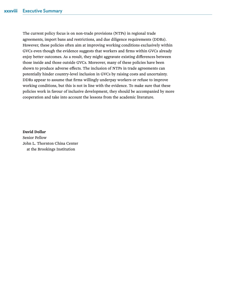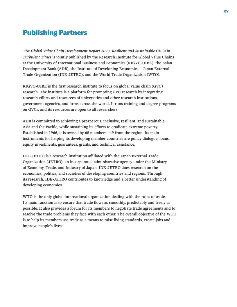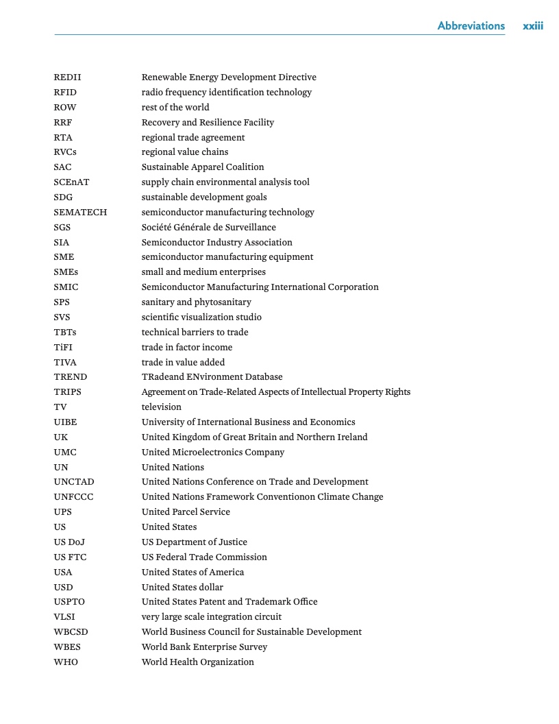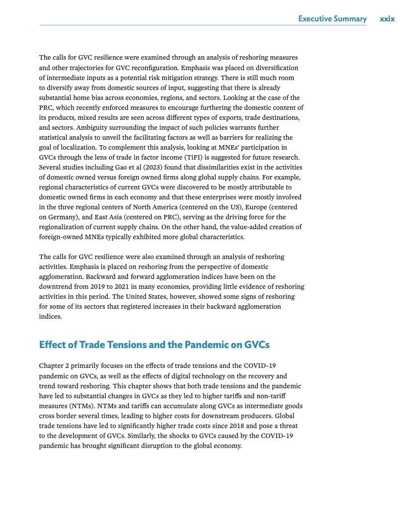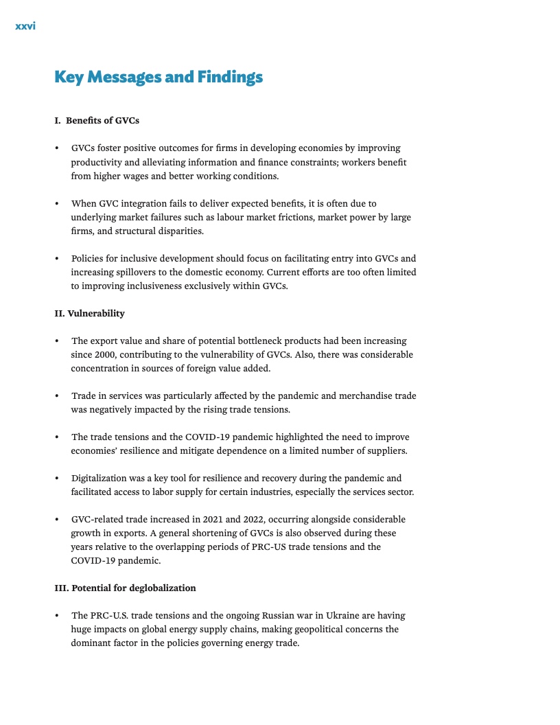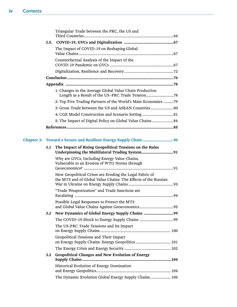 “最近发生的与新冠疫情相关的破坏事件暴露了全球价值链中长期存在的脆弱性,特别是与过度集中和过度依赖单一经济体或地区供应关键产品相关的脆弱性——最近的地缘政治紧张局势加剧了这种情况。然而,全球价值链目前的结构是复杂的,并为全球企业和消费者带来了巨大利益。”亚行行长浅川雅嗣、日本对外贸易组织主席深尾恭司、UIBE主席赵忠秀和世贸组织总干事恩古齐-奥孔乔-伊维拉在该出版物的联合前言中说。