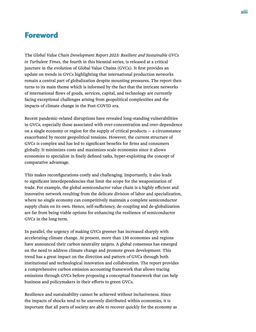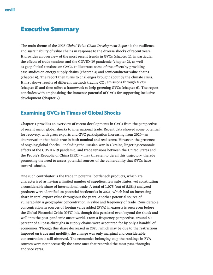该报告提供了全球价值链的最新趋势,并提供了延伸至2022年的新数据,强调尽管压力不断增加,全球价值链仍是全球化的核心部分。报告指出,去年外国投入占全球商品出口的28%,创下历史新高。此外,几乎所有经济体在2022年的全球价值链参与率都高于2018年新冠疫情前的水平。