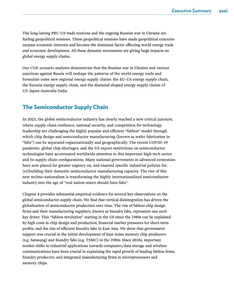 报告探讨了中美贸易紧张局势和新冠疫情对全球价值链的影响,并对能源和半导体供应链进行了深入讨论。报告发现,自 2000 年以来,潜在瓶颈产品(极少数经济体出口的产品)的出口额和份额增加了一倍多,从占贸易总额的 9% 增加到 19%,加剧了全球价值链的脆弱性。此外,外国投入的来源也相当集中。此外,中美贸易紧张局势导致 2018 年至 2020 年全球价值链的阶段数量增加。这可能是由于征收更高的关税导致各经济体从新的来源地采购产品,但在2021年,全球价值链的部分延长发生了逆转,这可能是由于新冠疫情限制了可用的选择。
