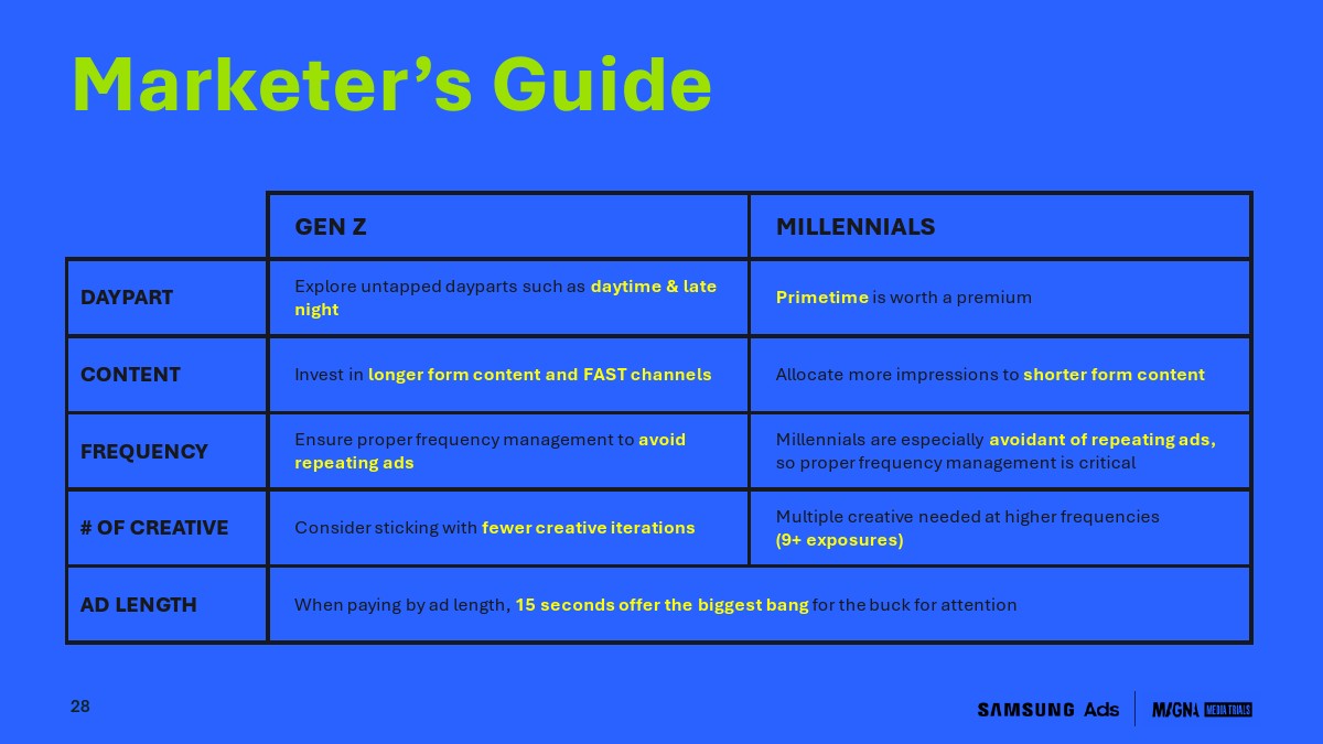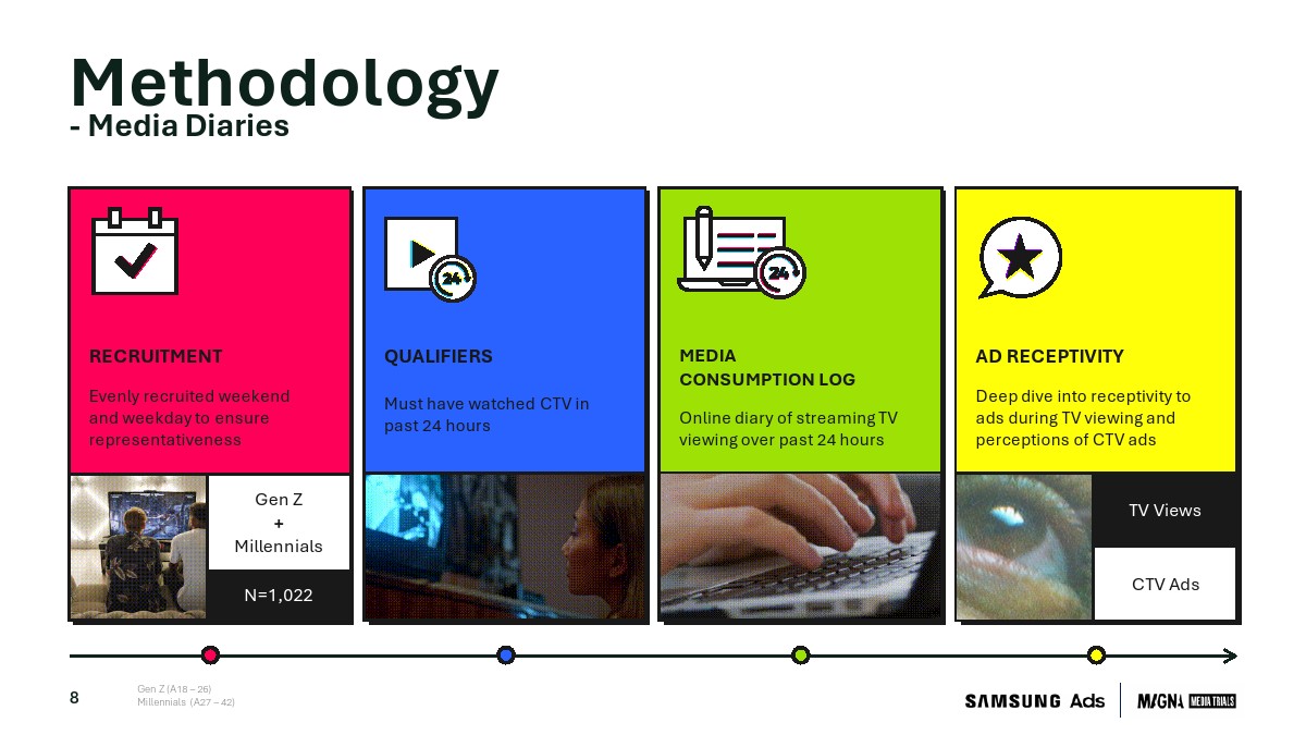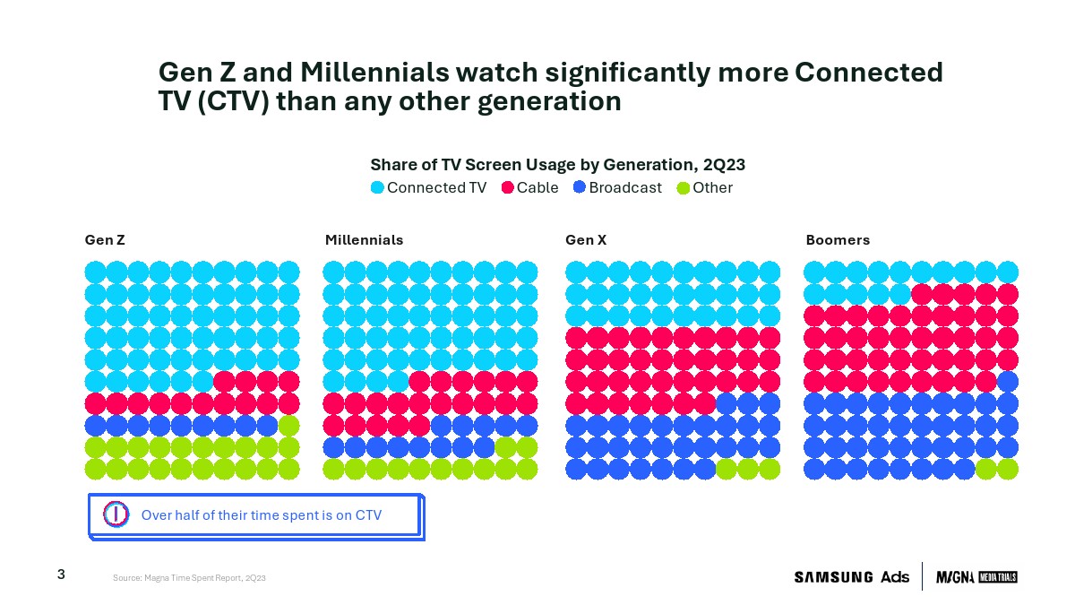 MAGNA Media Trials与三星广告合作发布了一项新研究“吸引年轻人的注意力”,探讨了Z世代和千禧一代观众的收视习惯。他们向数字平台进军,如联网电视(CTV),改变了收视习惯,为广告主争夺他们的注意力带来了新的挑战和机遇。