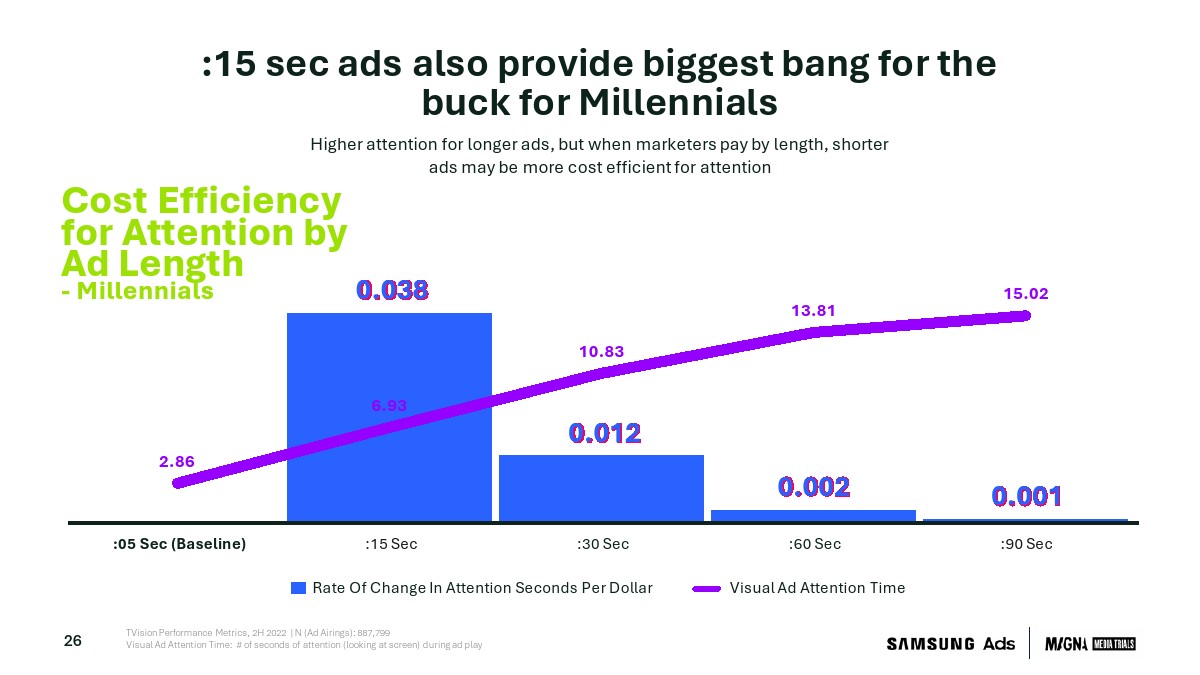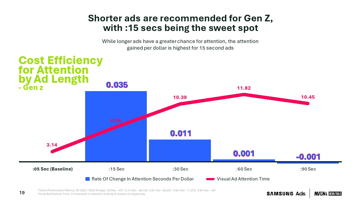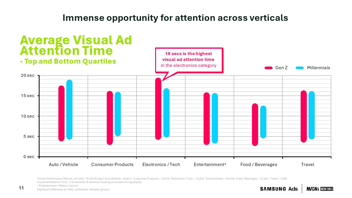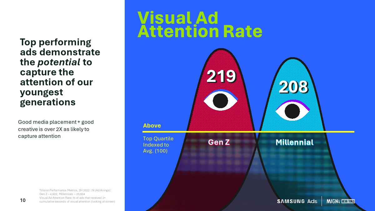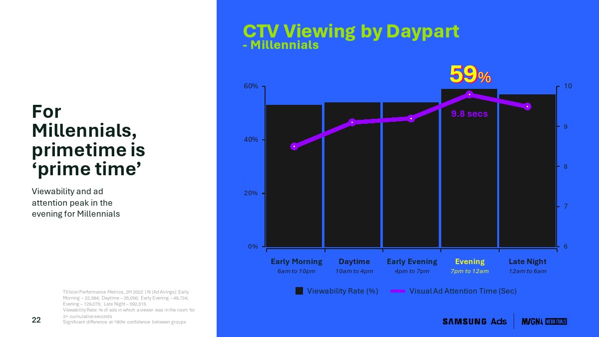 广告主尚未发现的是,Z世代在CTV上看广告的时间最长,平均每个广告锁定9.63秒。而千禧一代则在传统黄金时段集中注意力,每个广告时长9.8秒。