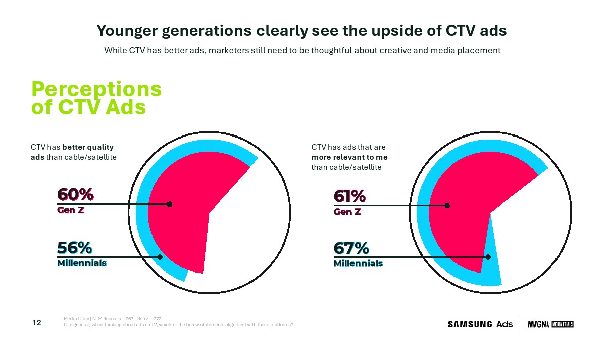 Z世代和千禧一代受访者认为在CTV上观看的广告质量更好,比在广播和有线电视上播放的广告更具相关性。例如,60%的Z世代和56%的千禧一代认为CTV的广告质量比有线电视和卫星电视更好,67%的千禧一代和62%的Z世代认为CTV广告更具相关性。