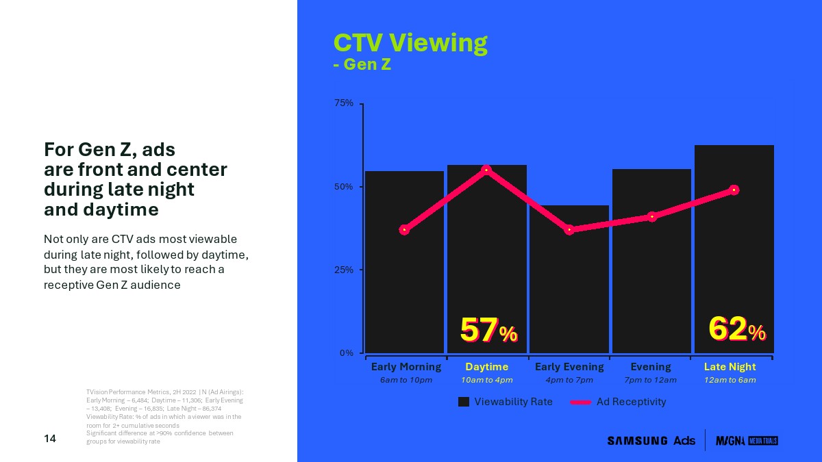 白天和深夜是Z世代的黄金时段。数据显示,深夜和白天的广告点击率最高(62%),分别为57%和55%。在传统的黄金时段,千禧一代的视频可见度最高,达到59%。