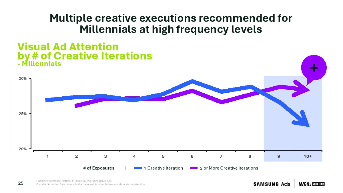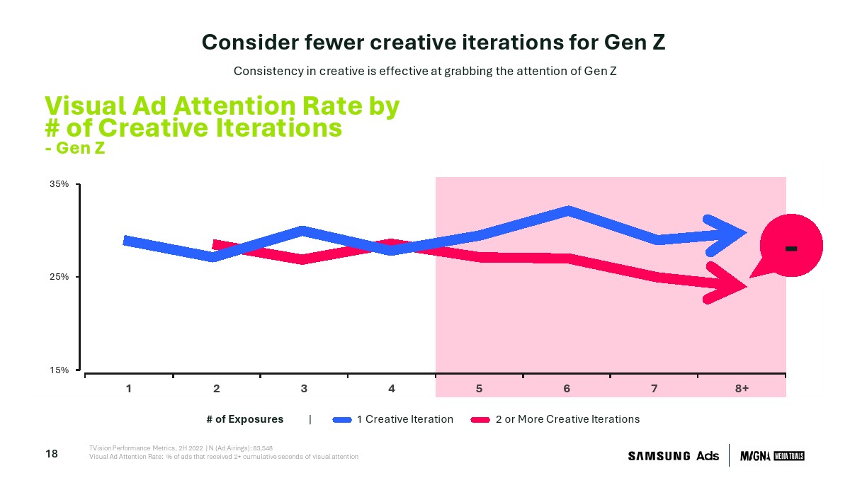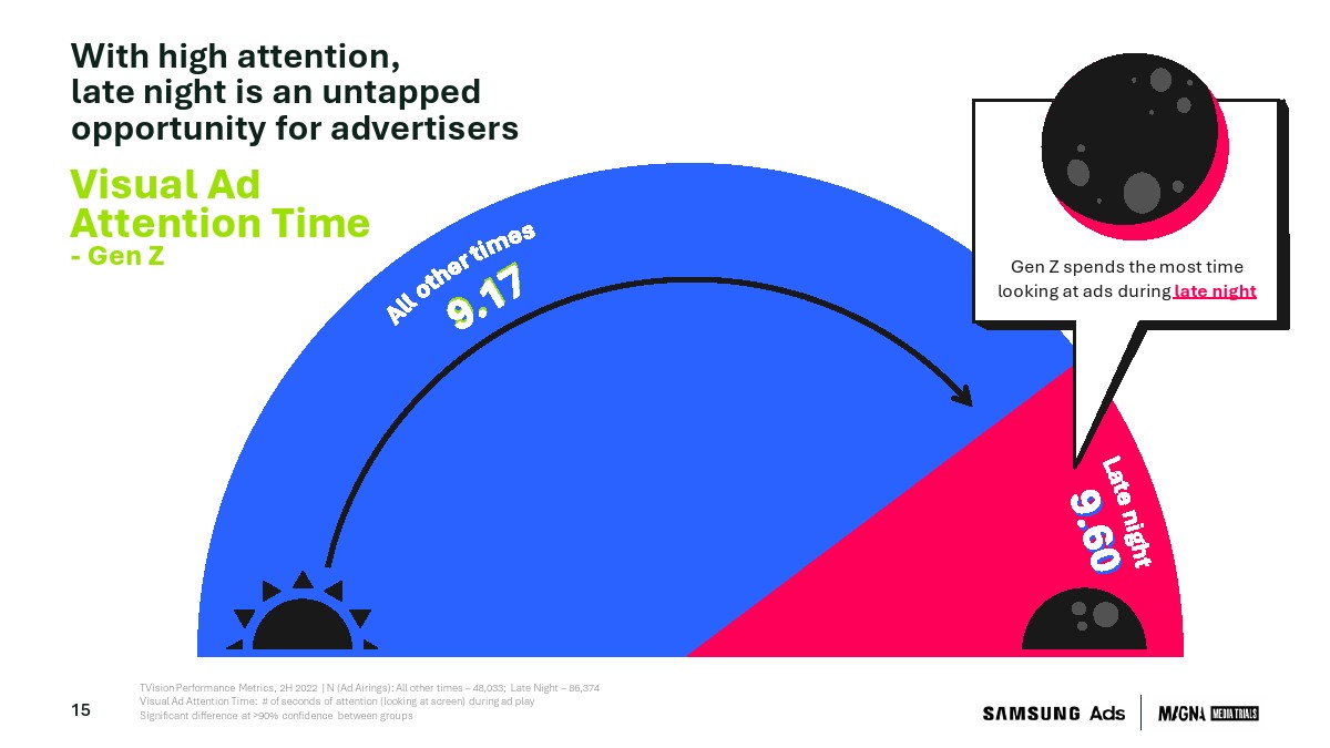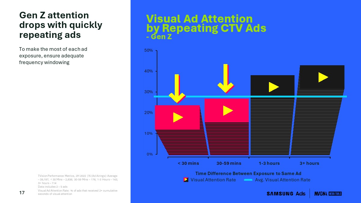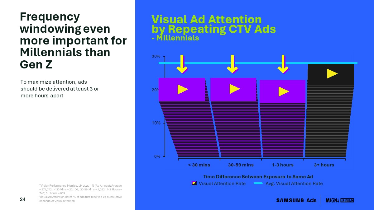 Z世代(43%)和千禧一代(28%)在同一广告间隔(3小时或更长时间)播出时,关注度达到了顶峰。
