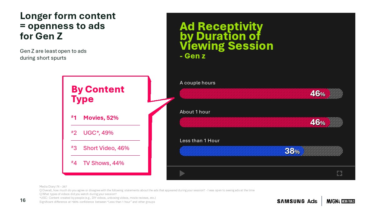 Z世代对长篇广告的容忍度更高,在一小时或更长时间内的广告接受度为46%,而短时间的广告接受度不到一小时(38%)。反过来,52%的人对电影期间的广告更开放,对电视节目的广告不太开放(44%)。