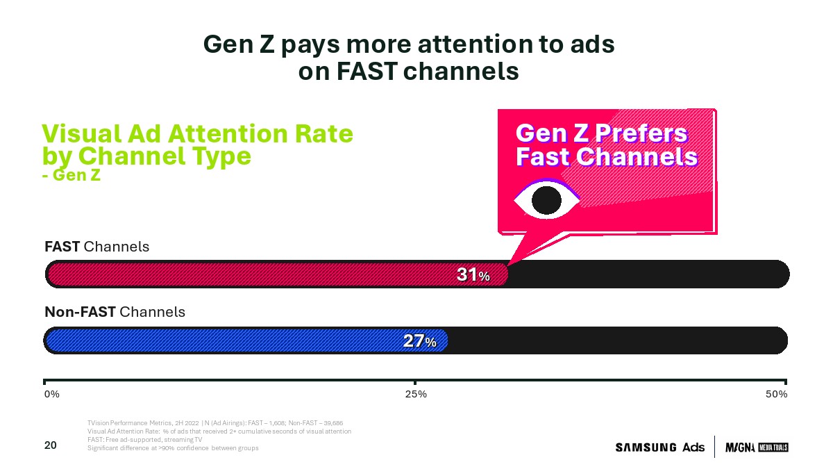 Z世代更关注出现在FAST频道的广告,这一比例为31%,而非FAST频道为27%。