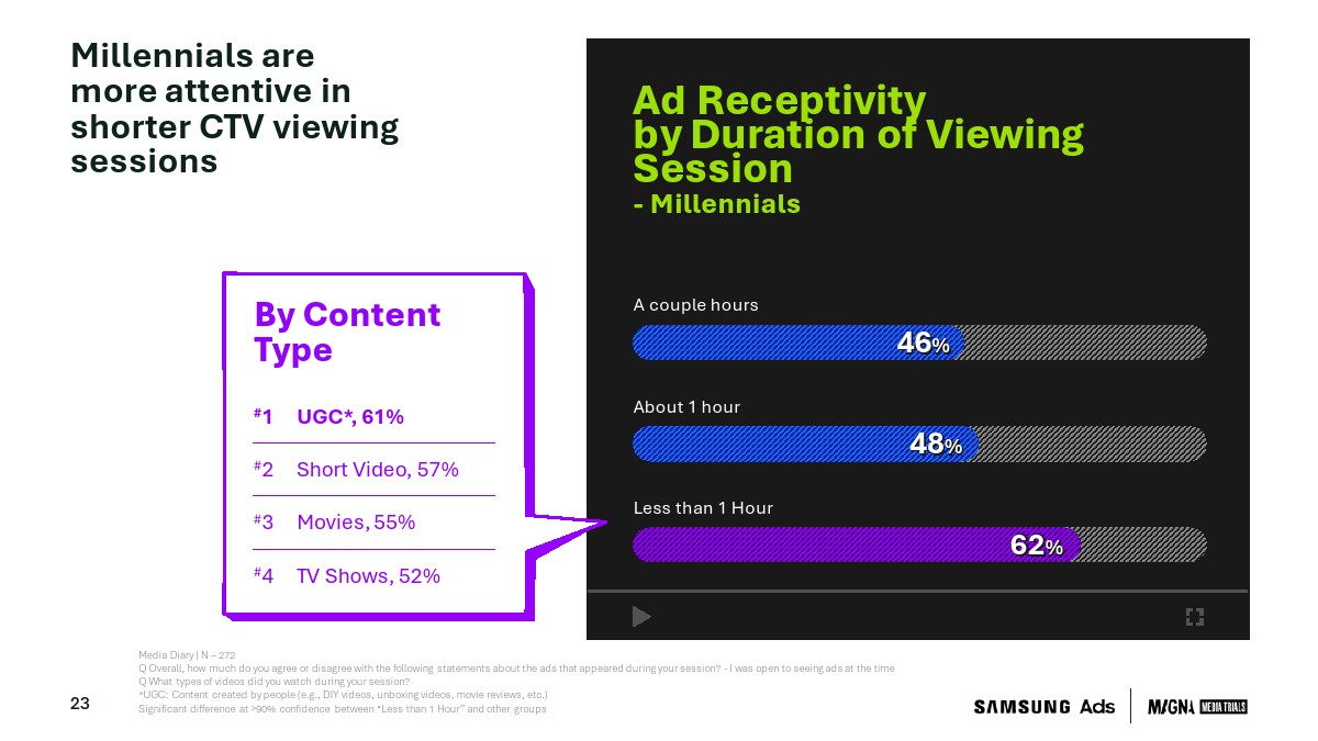 62%的千禧一代在不到一小时的时段对广告的关注度更高。61%的受访者对DIY节目中播放的广告最为开放。