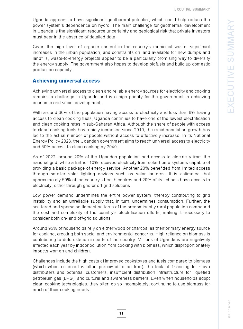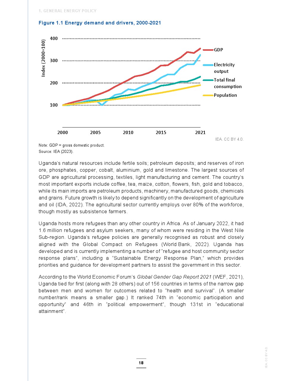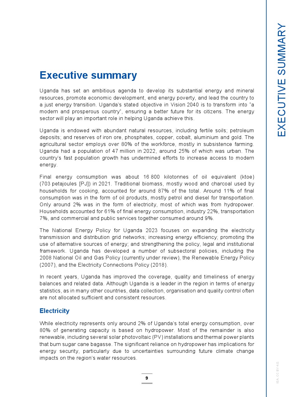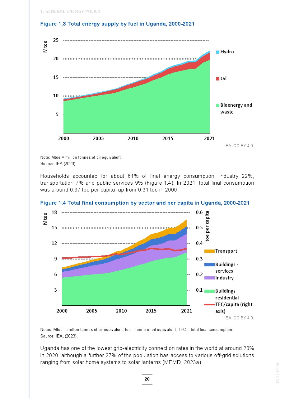 IEA发布了“2023年乌干达能源政策评价”。乌干达制定了一项雄心勃勃的议程,以开发其丰富的能源和矿产资源,促进经济发展,结束能源贫困,并领导该国实现公正的能源转型。在其《2040年愿景》中提出的目标是转型为“一个现代化和繁荣的国家”,确保其公民拥有更美好的未来。能源行业将在帮助乌干达实现这一目标方面发挥重要作用。