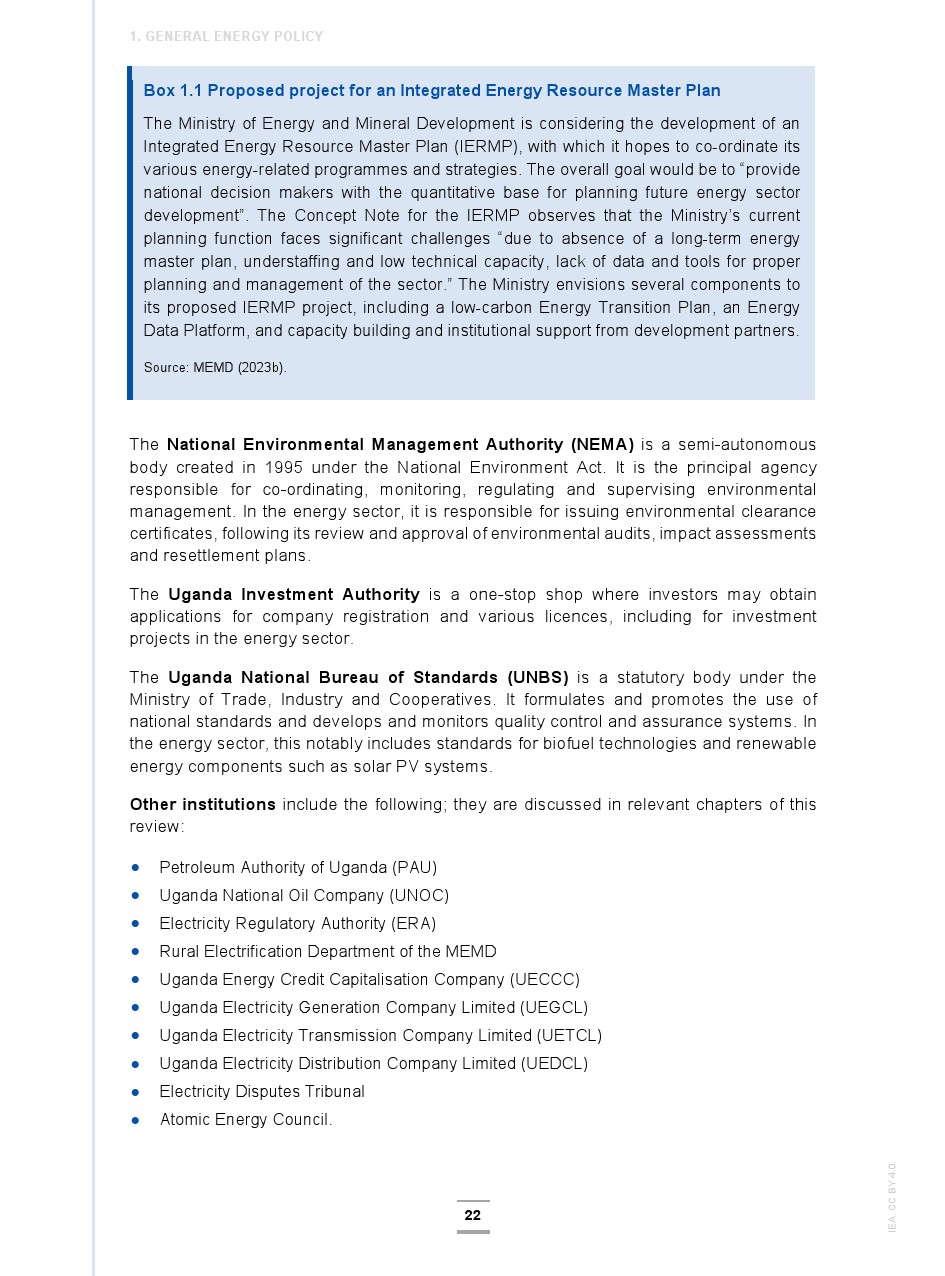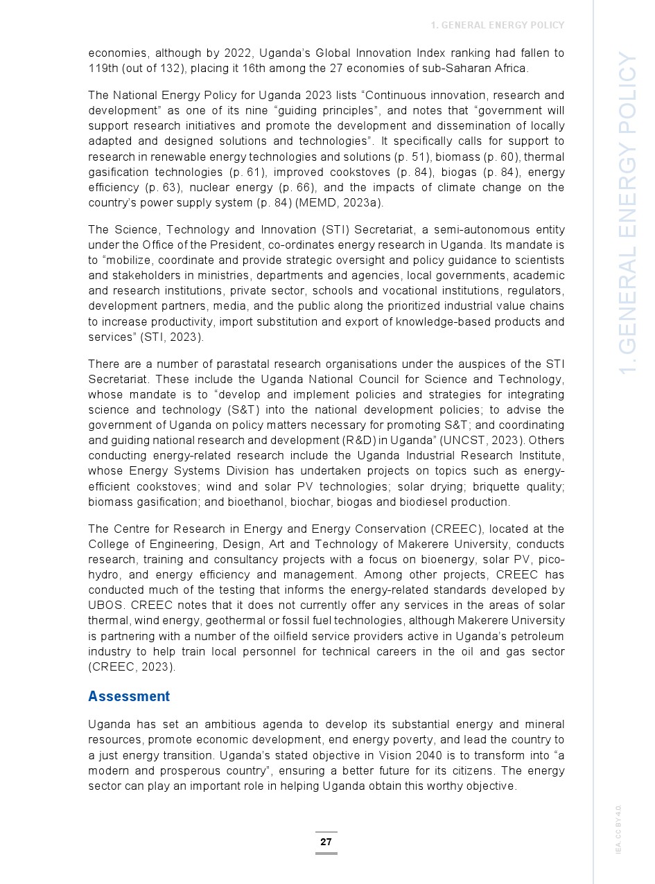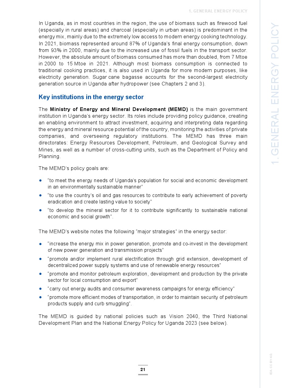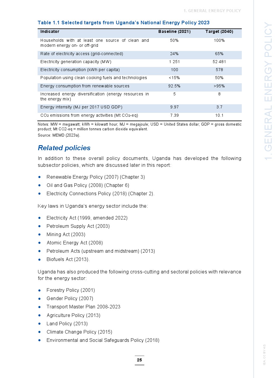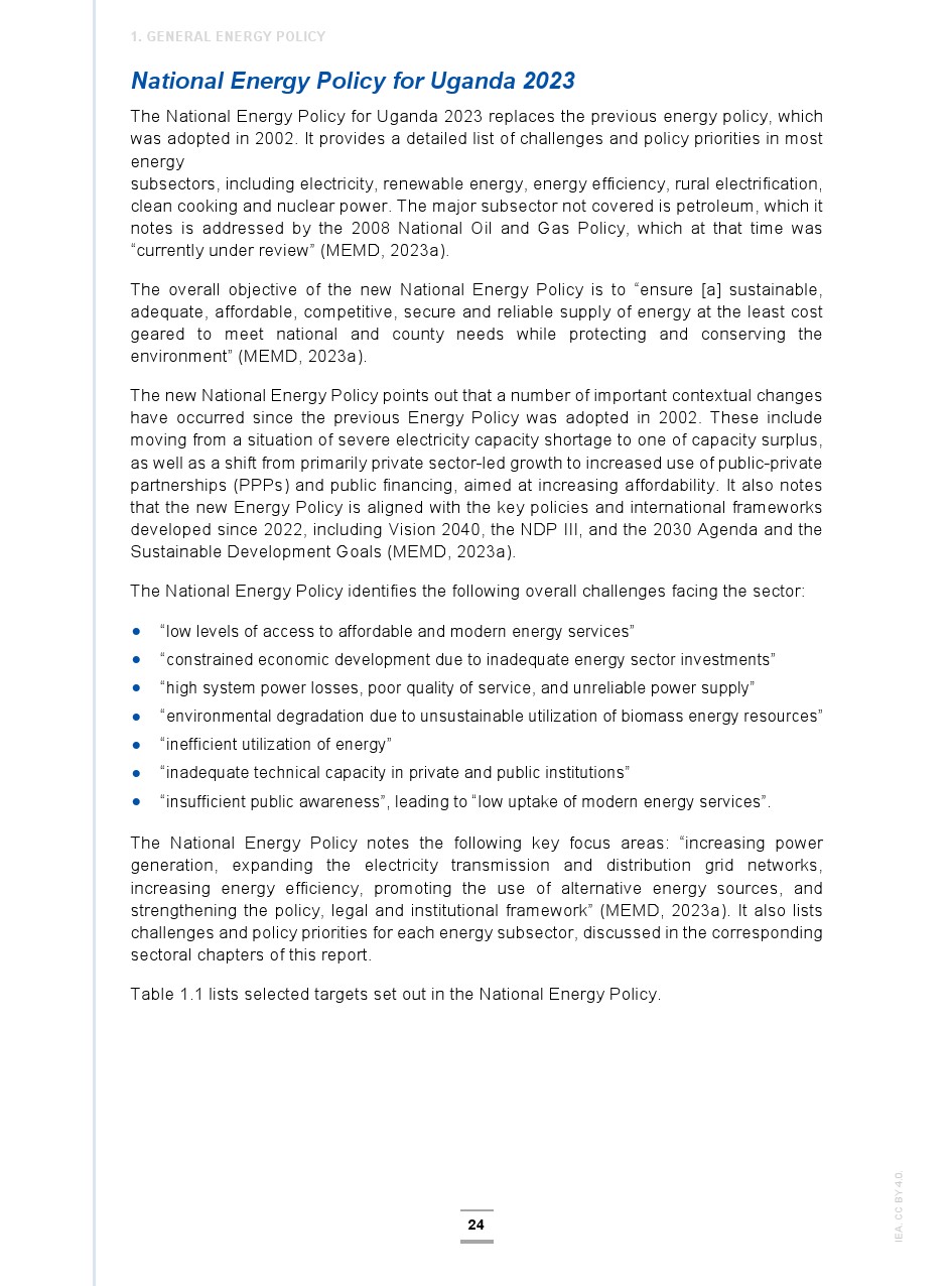 乌干达2023年国家能源政策侧重于扩大输配电电网、提高能源效率、促进使用替代能源、加强政策、法律和制度框架。乌干达制定了许多分部门政策。