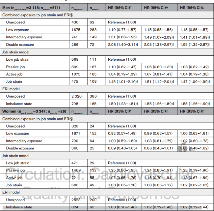 图1. 工作压力和付出-回报不平衡对冠心病发生单独和联合影响的风险比(HR)。图片来源:https://doi.org/10.1161/CIRCOUTCOMES.122.009700
