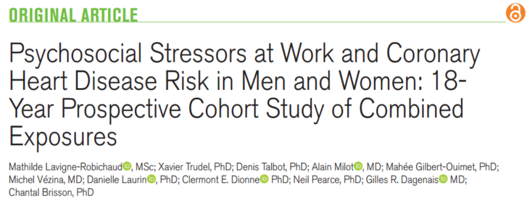 近日,来自加拿大魁北克大学的Chantal Brisson教授团队评估了工作压力和付出回报失衡(ERI)对冠心病发病率的单独和联合影响,该研究发表在美国心脏病协会AHA官方期刊Circulation子刊Circulation:Cardiovascular Quality and Outcomes 。研究发现,与没有工作压力的男性相比,工作压力大同时付出回报失衡的男性,患冠心病的风险升高103%。