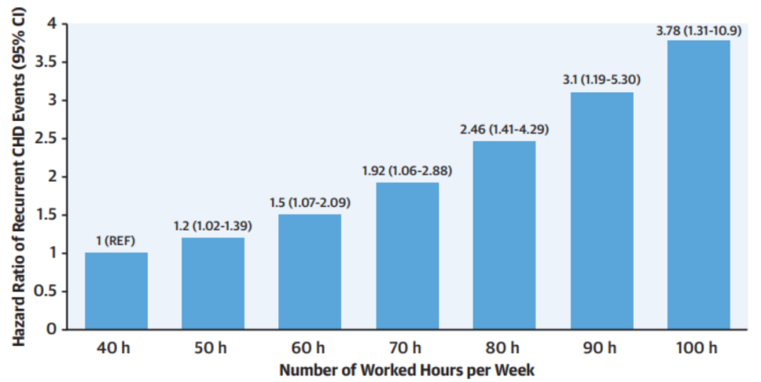 此外,2021年J Am Coll Cardiol上发表的一篇研究指出,工作压力是冠心病的危险因素,相比无工作压力人群,对于首次心梗后的患者,当每周工作时间较长时(≥ 55 小时),冠心病的复发风险会显著增高。当长时间工作与工作压力相结合时,风险的影响更大(图3)。一项对于中国人群的研究也表明,工作时间延长和以静坐为主的职业都提高了冠心病的发病风险,无论平时锻炼与否,长时间静坐的工作增加冠心病的发病风险。
