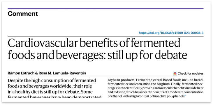 [1] Estruch, R., Lamuela-Raventós, R.M. Cardiovascular benefits of fermented foods and beverages: still up for debate. Nat Rev Cardiol (2023).