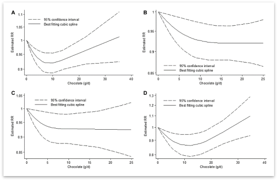 图:每日巧克力摄入量与几类疾病间的非线性剂量-反应关系(来源:文献[5])