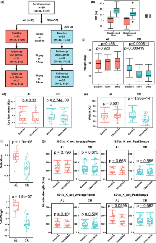 如图1所示,项目流程图中表明有90 名CALERIE参与者被随机分配到CR(卡路里控制)和AL(自由摄入)组,他们分别于项目初始时、12个月和24个月时接受肌肉活检以观察数据变化。多项数据在图中得以展示,其中数据分析显示CR组和AL组在24个月期间的腿部肌肉质量和整体体重的变化对比,以及肌肉力量变量的对比。图中的多项数据和对比显示,在卡路里控制组呈整体体重下降和变轻的同时,CL参与者的肌肉质量和机能表现出更好的稳定性和更优表现。这说明,卡路里控制可以在控制整体体重的同时,还保持良好的肌肉质量和结构。