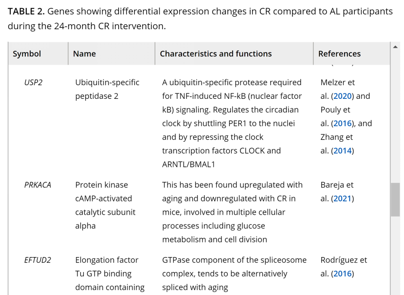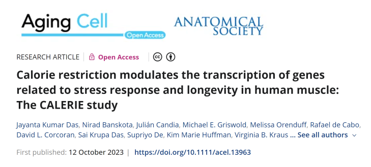Das, J. K., Banskota, N., Candia, J., Griswold, M. E., Orenduff, M., Corcoran, D. L., Das, S. K., De, S., Huffman, K. M., Kraus, V. B., Kraus, W. E., Martin, C. K., Racette, S. B., Redman, L. M., Schilling, B., Belsky, D. W., & Ferrucci, L. Calorie restriction modulates the transcription of genes related to stress response and longevity in human muscle: The CALERIE study. Aging Cell, e13963. https://doi.org/10.1111/acel.13963