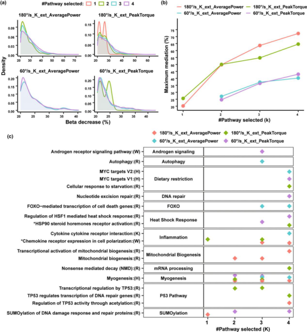 图3:针对CR对肌肉力量的影响,在不同生化通路中的回归分析。不同颜色的曲线和点代表60°和 180°膝伸展时等速测力法中的平均功率和峰值扭矩。来源:onlinelibrary.wiley.com