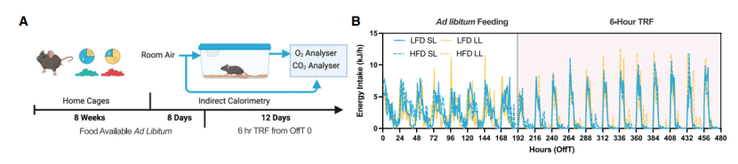 光周期的主要影响之一是对进食时间的影响。因此,他们接下来研究了不同光周期引起的生理差异是否是由于食物摄入的时间的影响。研究人员将小鼠分别喂食LFD或HFD,并在SL或LL光周期下饲养8周。然后将小鼠转移到间接量热系统中,其中给它们随意提供8天食物,然后进行6小时限时喂养(TRF)。研究发现,在不同光周期饲养的小鼠之间的许多代谢差异(RER,血浆NEFA,肝糖原,肝脏甘油三酯含量)是由于食物摄入时间的不同引起的。然而,饲养在SL光周期的小鼠体重和脂肪量的减少可能是由于在这期间新陈代谢的增加引起的。
