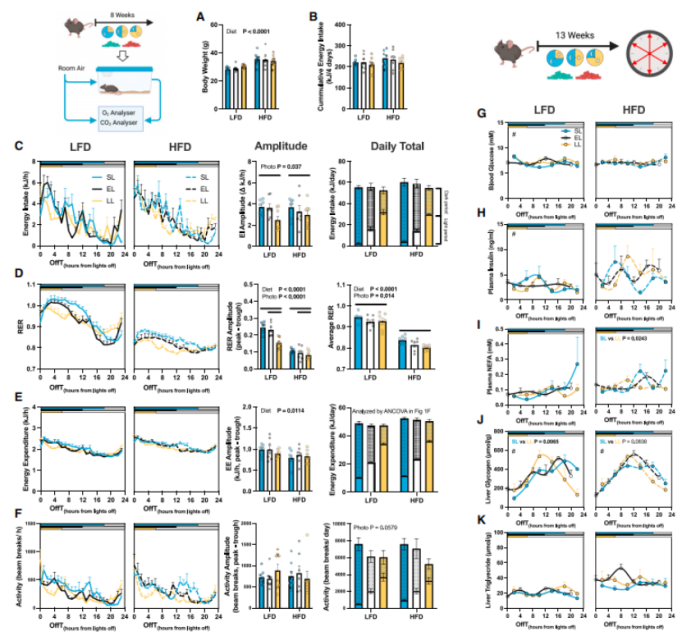 研究人员将小鼠随机喂食低脂饮食(LFD,10%脂肪)或高脂饮食(HFD,45%脂肪),并随机分配到三个不同光周期(SL 6L:18D,EL 12L:12D或LL 18L:6D)饲养13周。发现SL(冬日光)饲养的小鼠体重增加较为缓慢,体内脂肪减少,肝脏中甘油三酯含量较低,骨骼肌中甘油三酯含量、胰岛素和瘦素水平未受到光照长短的影响。