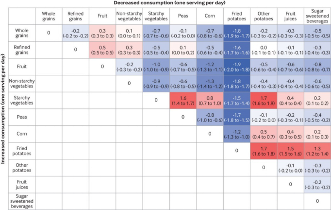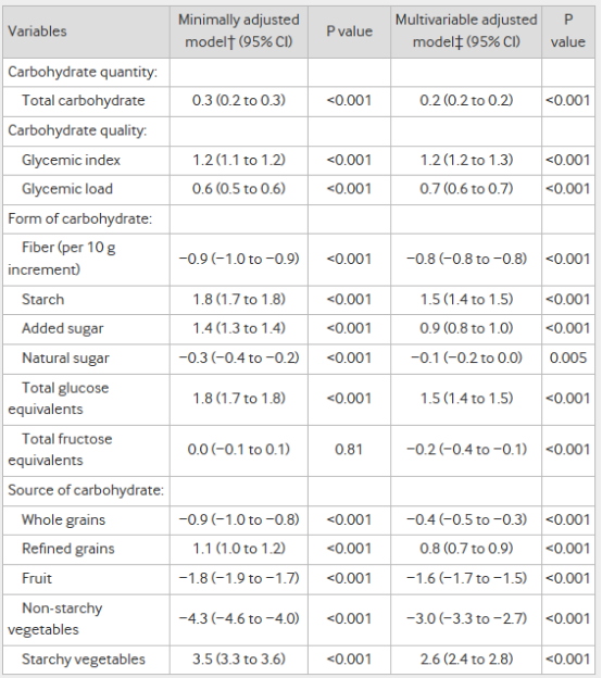 摄入精制谷物、总淀粉类蔬菜和含糖饮料会显著增加体重,而摄入全谷物、水果和非淀粉类蔬菜则增加体重较少,有助于减肥。从各种食物中摄入100克/天等量碳水化合物后每4年增加的体重有所不同。摄入精制谷物每4年体重增加0.8公斤,淀粉类蔬菜增加2.6公斤;然而,全谷物增加-0.4公斤、水果-1.6公斤和非淀粉类蔬菜-3.0公斤。