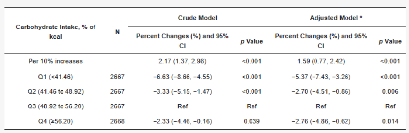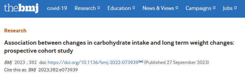[1] Wan Y, Tobias DK, Dennis KK, et al. Association between changes in carbohydrate intake and long term weight changes: prospective cohort study. BMJ. 2023;382:e073939. Published 2023 Sep 27. doi:10.1136/bmj-2022-073939