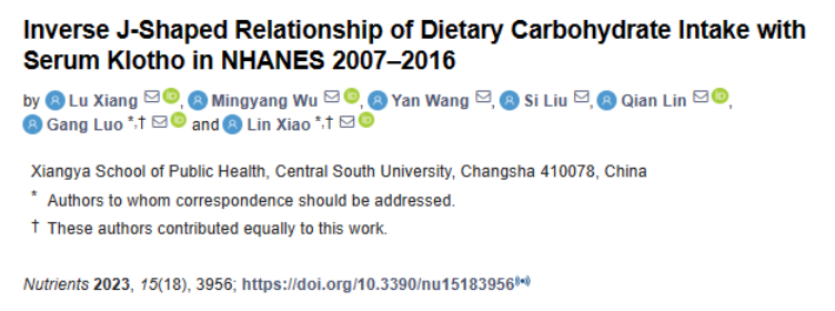 [2] Xiang L, Wu M, Wang Y, et al. Inverse J-Shaped Relationship of Dietary Carbohydrate Intake with Serum Klotho in NHANES 2007-2016. Nutrients. 2023;15(18):3956. Published 2023 Sep 13. doi:10.3390/nu15183956
