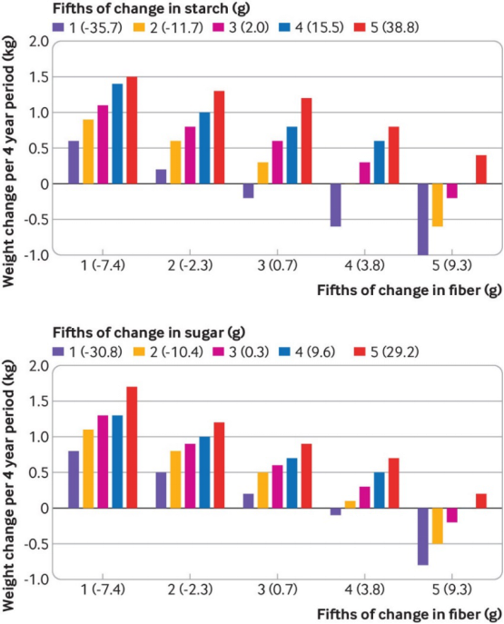 增加膳食中淀粉、添加糖和总葡萄糖的摄入会显著增加体重,而增加纤维、天然糖和总果糖的摄入则与体重增加较少有关,其中,水果中纤维增加体重的幅度最大。每增加100克/天的淀粉、添加糖或总葡萄糖当量,4年平均体重分别增加1.5公斤、0.9公斤或1.5公斤。相比之下,每增加10克/天的纤维、100克/天的天然糖或总果糖当量,在4年中体重增加0.8千克、-0.1千克或-0.2千克。