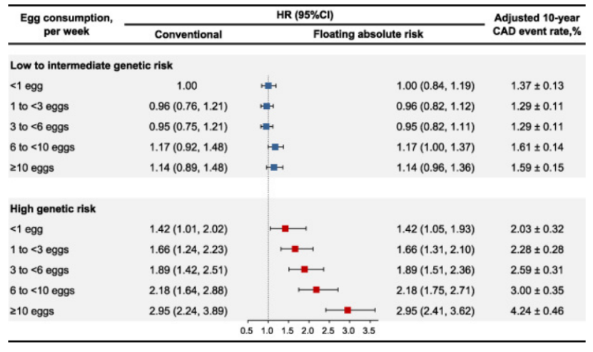 结果发现,随着鸡蛋摄入量的增加,高血压和糖尿病的患病率以及发生 CAD 的风险也会增加。在中位随访 11.7 年中,参与者报告了 1,128 例 CAD 病例。