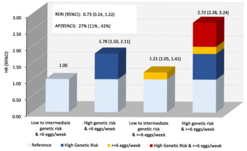 在这项大型前瞻性研究中,研究人员观察到较高的鸡蛋摄入量和 PRS 均与 CAD 风险升高相关,这是首次发现鸡蛋与基因之间存在显着的协同相互作用,表明鸡蛋摄入量与具有不同遗传背景的个体之间的 CAD 风险可能并不相同。