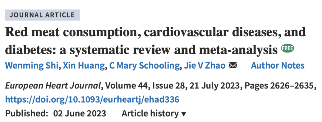 Shi W, Huang X, Schooling CM, Zhao JV. Red meat consumption, cardiovascular diseases, and diabetes: a systematic review and meta-analysis. Eur Heart J. 2023 Jul 21;44(28):2626-2635. doi: 10.1093/eurheartj/ehad336. PMID: 37264855.