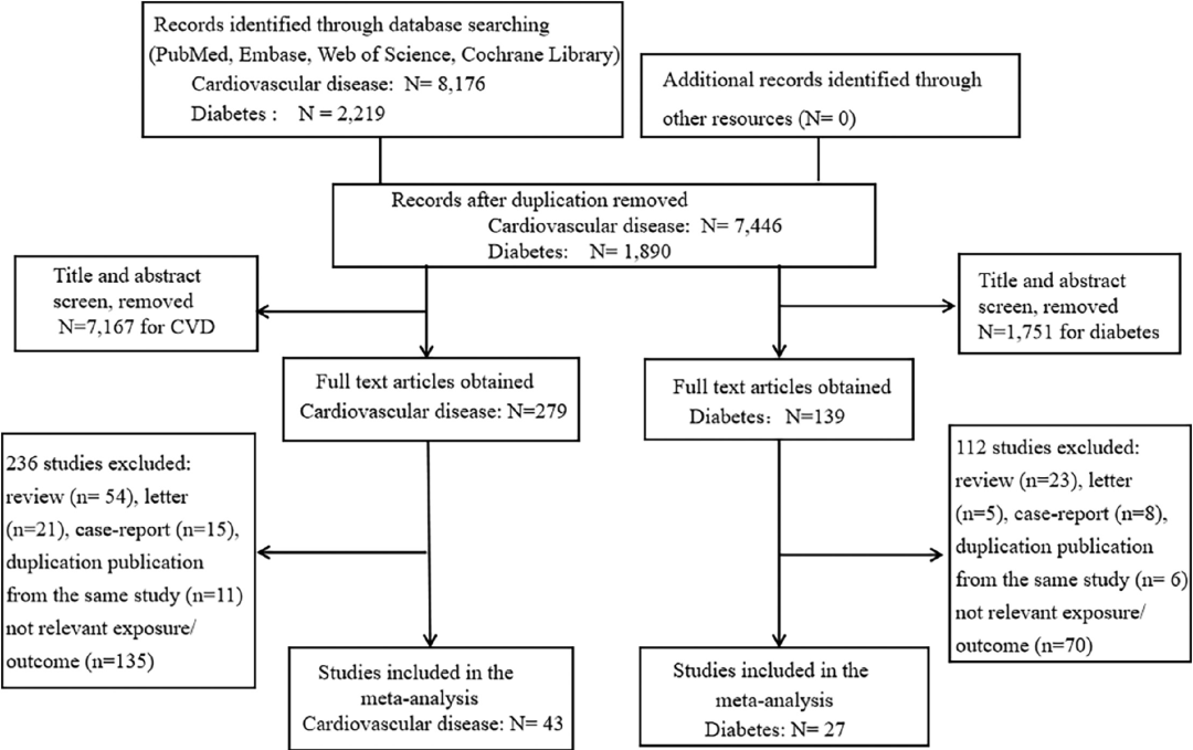 为全面评估红肉与健康的关系,包括不同的红肉类型、性别以及地理区域,研究者在7446项和1890项符合潜在条件的CVD和糖尿病相关研究中,最终筛选并纳入了43项CVD研究进行Meta分析,涵盖17项冠心病、16项中风和6项心力衰竭,以及27项糖尿病研究,涵盖23项2型糖尿病和4项妊娠期糖尿病。