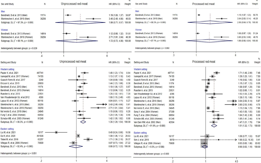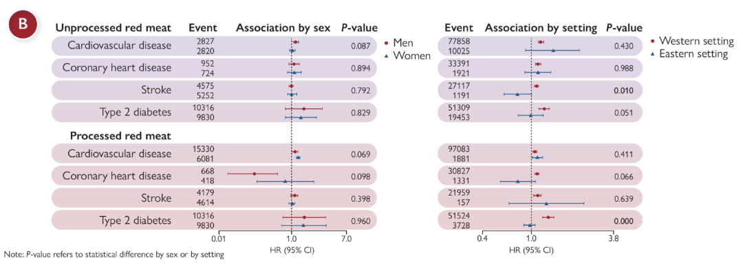 分组分析表明,与东部地区相比(包括亚洲和西非,多遵循东方饮食习惯,即全谷物、蔬菜和海鲜的摄入量较高),西部地区(包括美国、欧洲和澳大利亚,多遵循西方饮食习惯,即加工肉类、红肉、黄油、高脂肪乳制品和精谷物的摄入量较高)的加工红肉消费量与2型糖尿病之间的关联性更高。