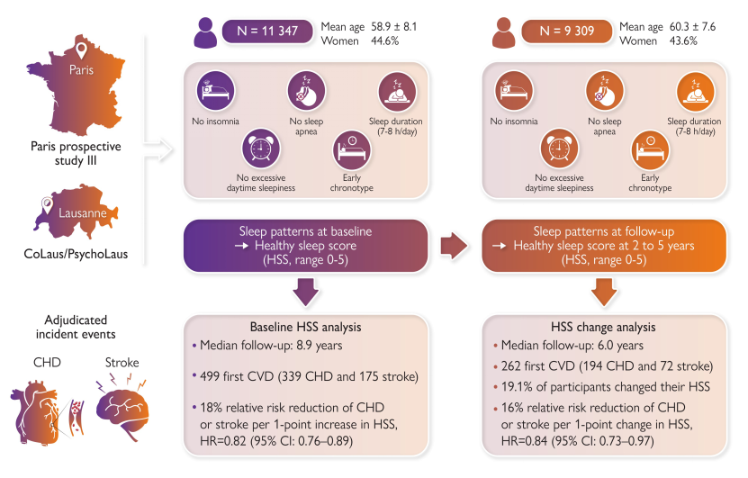 这项研究整合了两个欧洲前瞻性队列研究的数据,即巴黎前瞻性研究III(法国巴黎)和CoLaus|PsyCoLaus研究(瑞士洛桑),共包括11,347名无心血管疾病的参与者。研究人员使用了健康睡眠评分(HSS)标准: 这项标准结合了五种睡眠模式,包括早起型模式、每晚7-8小时的睡眠模式、从不或很少有失眠症状模式、没有阻塞性睡眠(呼吸暂停)模式,以及没有白天过度嗜睡模式。每种睡眠模式如果是最佳的就得1分,否则得0分。这个得分的范围是0到5,得分越高表示拥有更多最佳的睡眠模式。