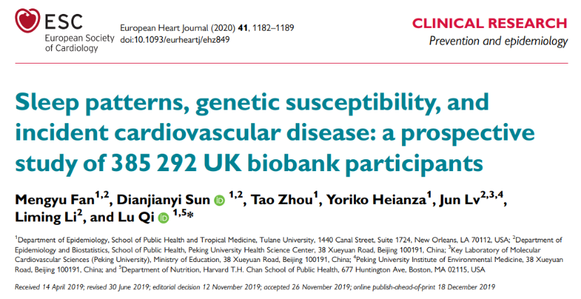 无独有偶,早在2019 年 12 月,European Heart Journal就已经开始关注针对睡眠与心血管疾病的研究,一篇题为Sleep patterns, genetic susceptibility, and incident cardiovascular disease: a prospective study of 385 292 UK biobank participants的项目对包括了英国385 292 名最初没有心血管疾病的参与者进行了长时间的随访研究。通过对参与者睡眠行为的评估和统计分析,作者发现:健康的睡眠模式与低、中或高遗传风险参与者的 CVD、CHD 和中风风险降低相关。