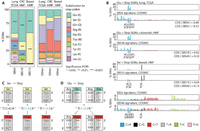 为了探索SGM在三大突变过程中富集的遗传机制,研究团队研究了最常被终止密码子取代的氨基酸类型,重点关注肺癌、乳腺癌和结直肠癌中的吸烟、APOBEC和ROS特征,发现几种突变类型的氨基酸经常被终止密码子取代。