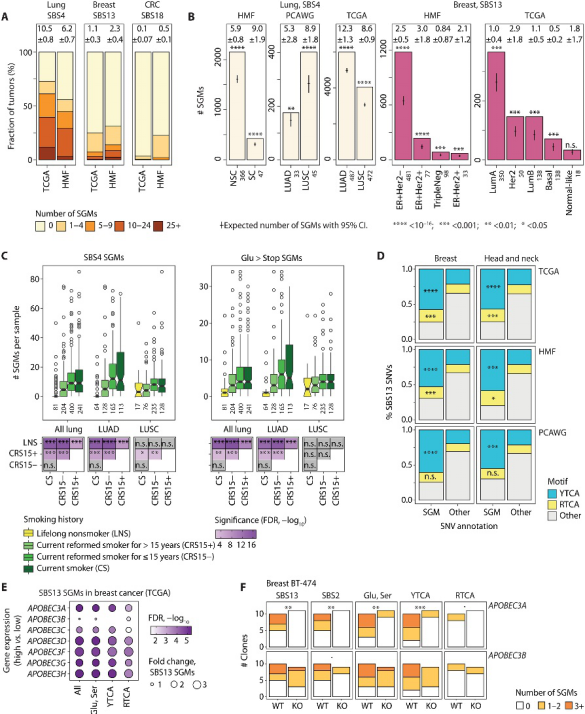 接下来研究了SGM特征在癌症亚型水平上的活性。在TCGA数据库的原发性肺腺癌(LUAD)和鳞状细胞癌(LUSC)以及HMF数据集中的转移性非小细胞癌和小细胞癌中检测到吸烟特征SGM的积累。APOBEC与乳腺癌SGM的关联也在主要的组织学和分子癌症亚型中得到证实,并且在原发性乳腺癌和源自乳房的转移性癌症中也被检测到。此外,产生SGM的突变过程在肺癌和乳腺癌亚型癌症中都很活跃。