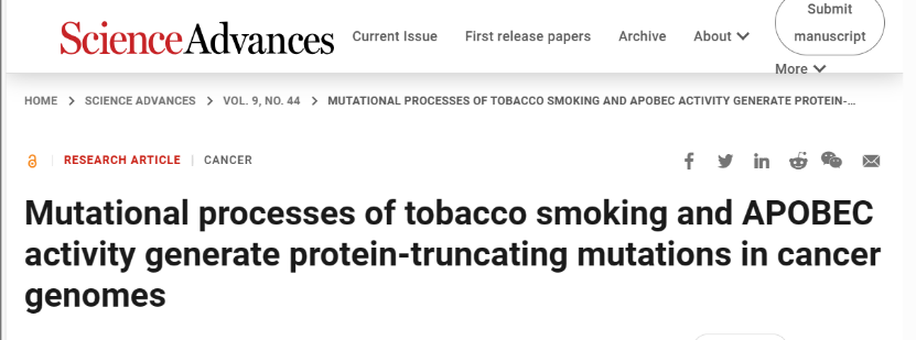 近来,加拿大安大略省癌症研究所(OICR)相关研究团队在Science Advances杂志上发表的研究揭示了其中的秘密[1]。这一研究将吸烟、活性氧(ROS)或APOBEC活性增强与无义突变联系起来,表明吸烟会减少抑癌相关蛋白的形成,让细胞增殖更加难以控制。