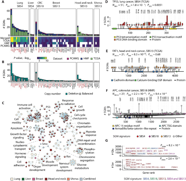 为了进一步从功能上解释突变,研究团队优先选择癌症类型的SGM基因,富集分析后突出了细胞凋亡、生长因子信号传导、细胞运动以及细胞增殖和发育等生物学过程和途径。大多数检测到的途径在多种癌症类型中被确定,这些途径发挥作用离不开癌症中的吸烟信号和APOBEC信号。因此,这些突变过程产生的SGM汇聚到抑癌基因和癌症途径,从而促进LOF、肿瘤发生和肿瘤进展。