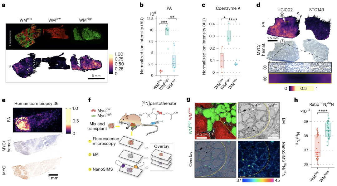 结果显示,具有最高MYC水平或强MYC转录特征的PDXs,显示出泛酸水平的显著增加。此外,肿瘤微卫星不稳定性(MSI)检测也明确,肿瘤间和肿瘤内的MYC高表达区域中,泛酸水平明显升高。