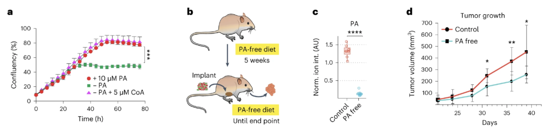 为了证实这一观点,研究者通过饮食控制了乳腺癌小鼠体内的全身PA水平,将小鼠分为无PA饮食或正常对照组饮食。