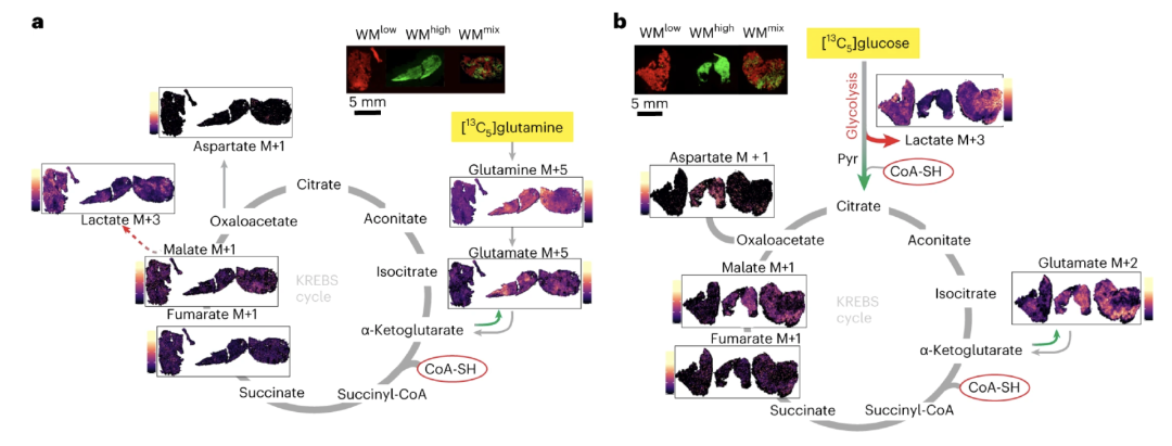 解吸电流聚焦电离(DEFFI)质谱成像(MSI)和荧光显微镜观察结果显示,具有MYC-ER结构的肿瘤内三羧酸循环活性明显增加。这意味着,MYC活性的增加能够提升PA的吸收和代谢,从而促进三羧酸循环的活跃性,以及代谢产物的摄取,进一步刺激了肿瘤细胞的高速生长。